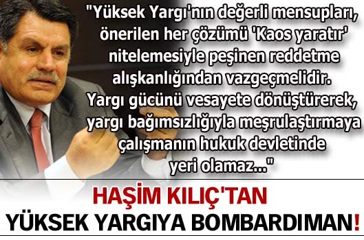 "Yüksek Yargı'nın değerli mensupları, önerilen her çözümü 'Kaos yaratır' nitelemesiyle peşinen reddetme alışkanlığından vazgeçmelidir. Yargı gücünü vesayete dönüştürerek, yargı bağımsızlığıyla meşrulaştırmaya çalışmanın hukuk devletinde yeri olamaz"