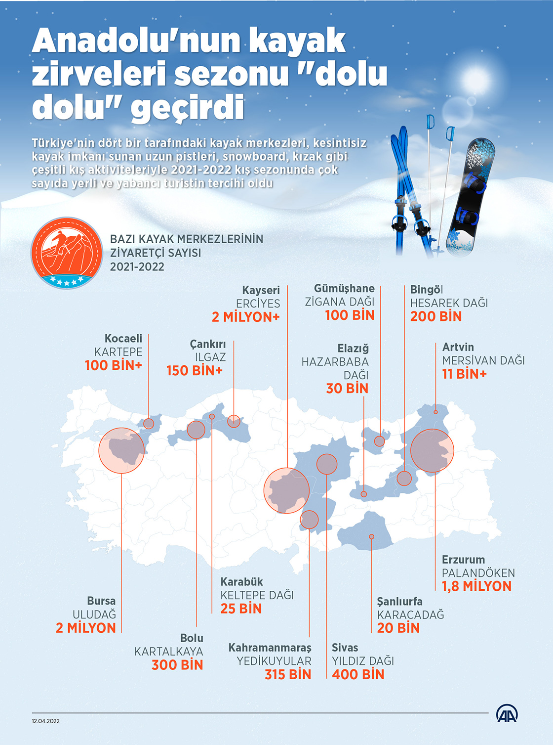 Türkiye'nin dört bir tarafındaki kayak merkezleri, kesintisiz kayak imkanı sunan uzun pistleri, snowboard, kızak gibi çeşitli kış aktiviteleriyle 2021-2022 kış sezonunda çok sayıda yerli ve yabancı turistin tercihi oldu.