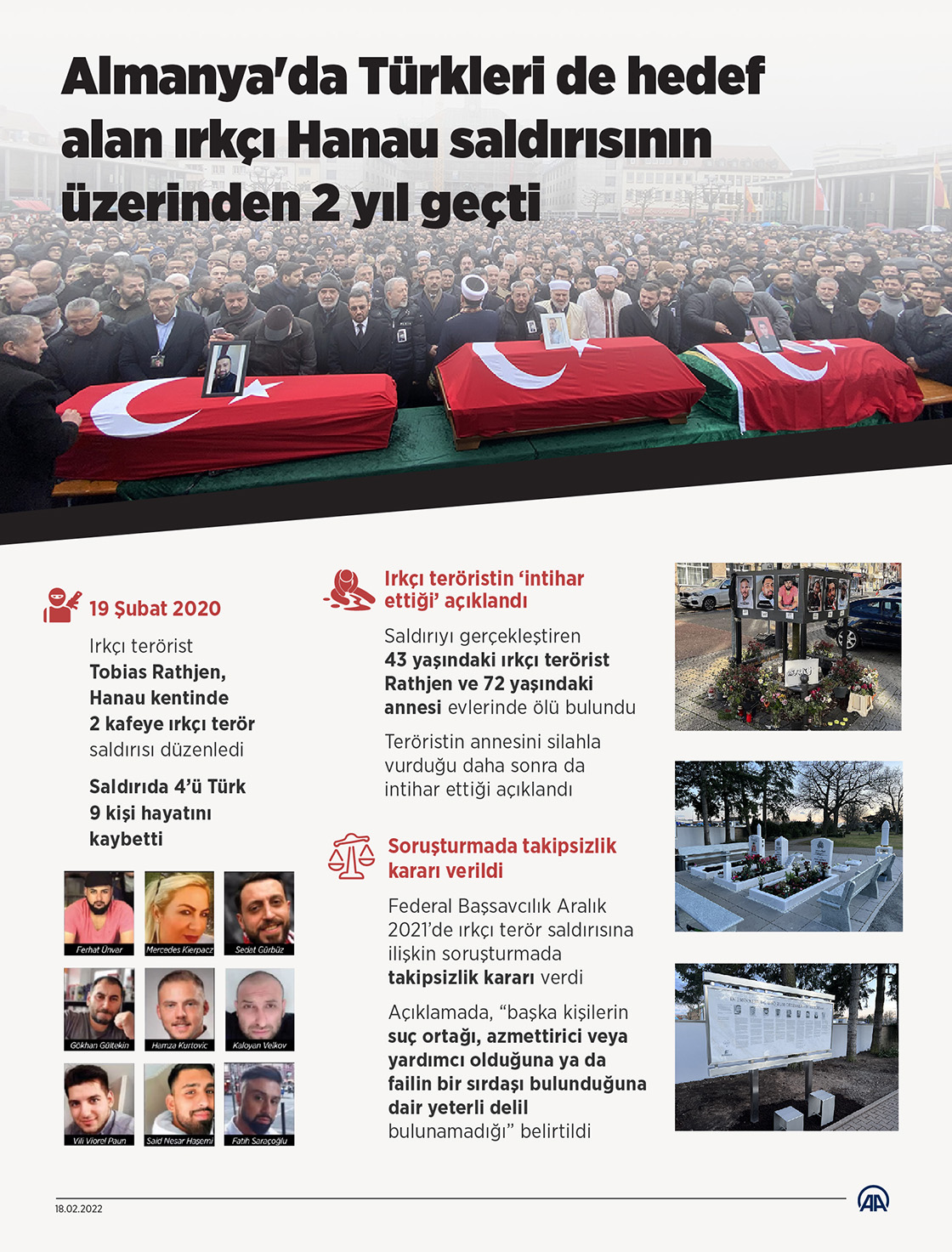 Almanya'nın Hanau kentinde 19 Şubat 2020'de ırkçı terörist Tobias Rathjen tarafından şehir merkezindeki iki kafeye düzenlenen saldırı sonucu 4'ü Türk, 9 kişinin yaşamını yitirmesinin acısı, tazeliğini koruyor.