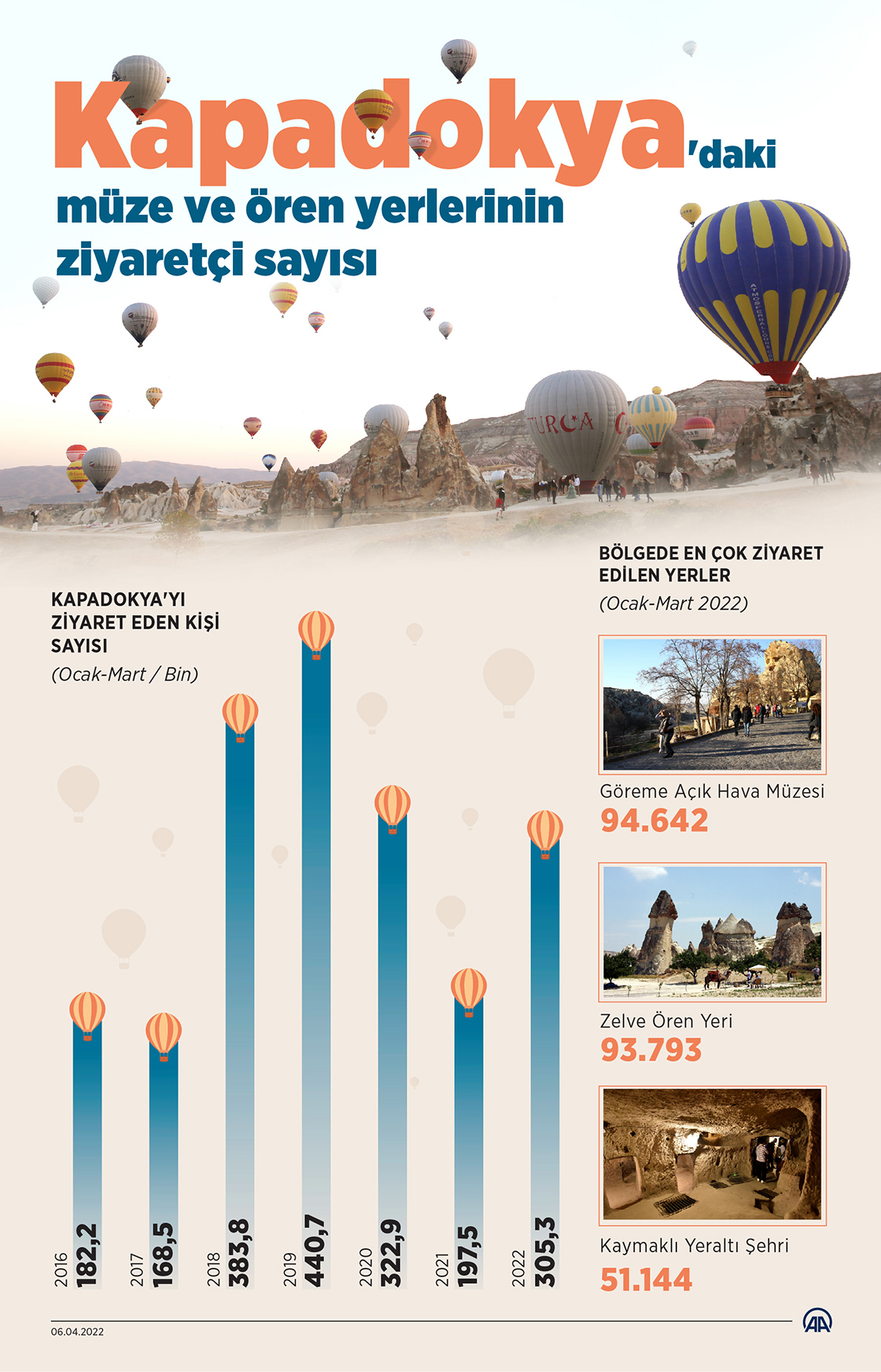 AA muhabirinin, Ulaştırma ve Altyapı Bakanlığı Sivil Havacılık Genel Müdürlüğü verilerinden derlediği bilgilere göre, geçen yıl bölgede düzenlenen sıcak hava balon turuna, ocakta 8 bin 289, şubatta 11 bin 265, martta 18 bin 363, nisanda 12 bin 627, mayısta 8 bin 528, haziranda 31 bin 421, temmuzda 47 bin 732, ağustosta 63 bin 845, eylülde 46 bin 773, ekimde 76 bin 104, kasımda 41 bin 1, aralıkta ise 22 bin 885 kişi katıldı.