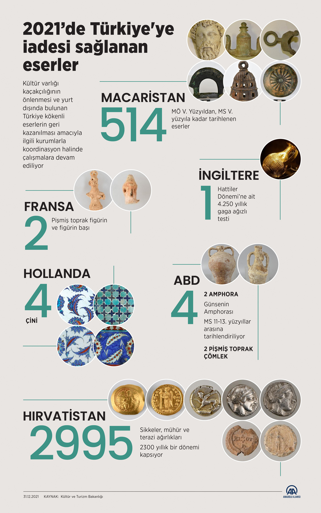 Sonuç olarak, 2022'de 11 farklı grupta 1121 eserin iadesi sağlanarak, ait oldukları topraklarda sergilenmeye başlandı.....(AA) |