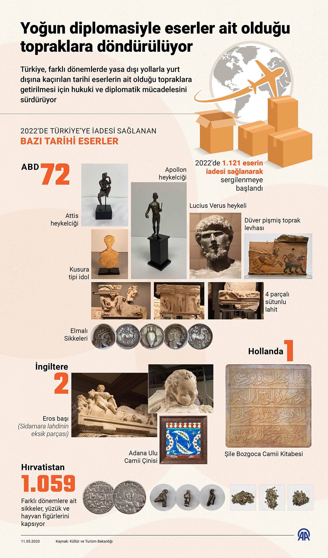 Türkiye, yasa dışı yollarla kendi topraklarından çıkarılan eserlerin tespit edilerek iadesinin sağlanması için ilgili ülkelerle hukuki ve diplomatik ilişkiler çerçevesinde çalışmalarına devam ediyor.