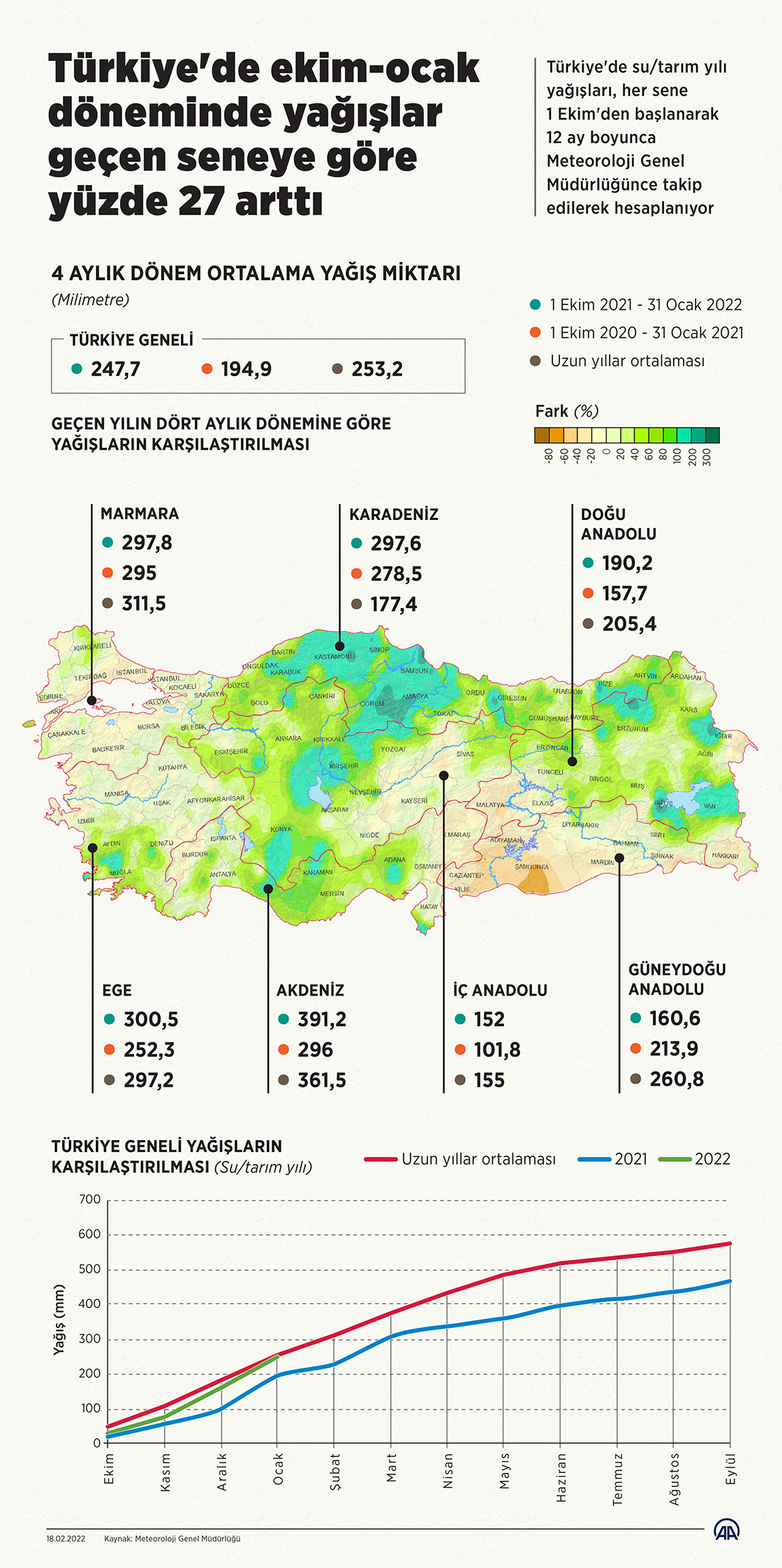 2021 su/tarım yılının ilk 4 aylık döneminde 194,9 milimetre, 2022 su/tarım yılının aynı döneminde ise 247,7 milimetre yağış düştü. Buna göre, Türkiye'de 2022 su/tarım yılı yağışları, uzun yıllar ortalamasını gerisinde kalırken, geçen yılın (su/tarım yılı) aynı dönemine göre yüzde 27 artış gösterdi.