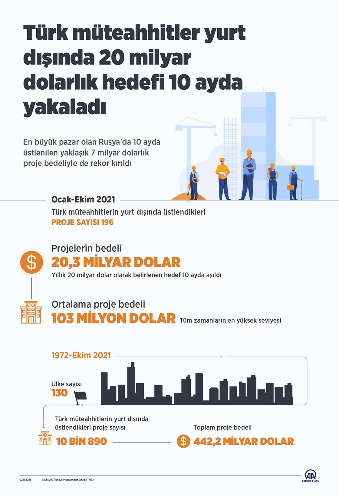 Türkiye Müteahhitler Birliğinden (TMB) yapılan yazılı açıklamaya göre, Türk müteahhitler, ekim ayı sonu itibarıyla yurt dışında aldıkları 196 yeni projeyle 20,3 milyar dolarlık iş üstlendi. Bu tutarla 2021 yılının tümü için hedeflenen 20 milyar dolar rakamı 10 ayda aşılmış oldu.