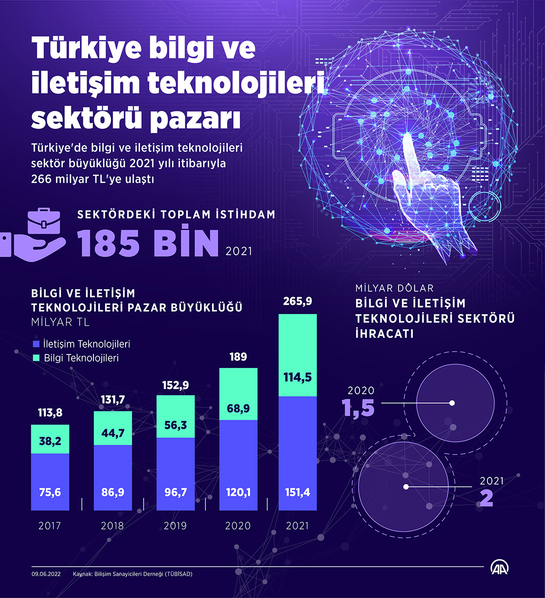 Dünyadaki gelişmelere paralel olarak Türkiye’deki bilişim ve alt sektörleri de hızlı bir gelişme gösteriyor. Bilişim sektöründeki hizmet ihracatı 2019'da 1 milyar 462 milyon dolar, 2020 yılında 2 milyar 92 milyon dolar ve 2021 yılında 2 milyar 533 milyon dolar olarak gerçekleşti. (Kaynak: AA) |