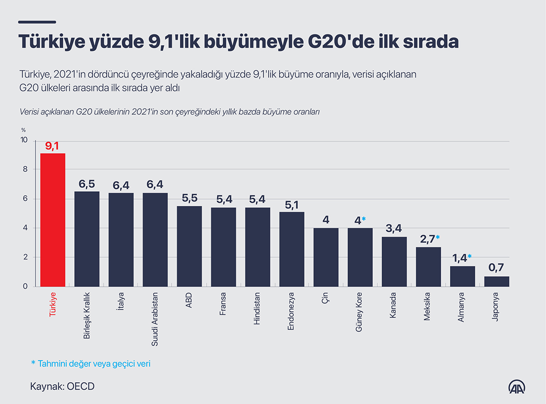 Türkiye, 2021'in son çeyreğinde elde ettiği yıllık bazda yüzde 9,1'lik performansıyla büyüme verisi açıklanan G20 ülkeleri arasında ilk, Ekonomik İşbirliği ve Kalkınma Örgütü (OECD) ülkeleri arasında üçüncü sırada yer aldı.