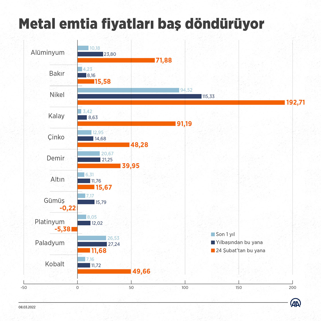 Söz konusu dönemde paladyum fiyatları ons başına yüzde 25,6 artışla 2 bin 484 dolar seviyesinden 3 bin 120 dolara yükselirken, nikelin ton fiyatı da yüzde 88 artışla 24 bin 900 dolardan 46 bin 800 dolara çıkarak Haziran 2007'den beri en yüksek seviyesine ulaştı.