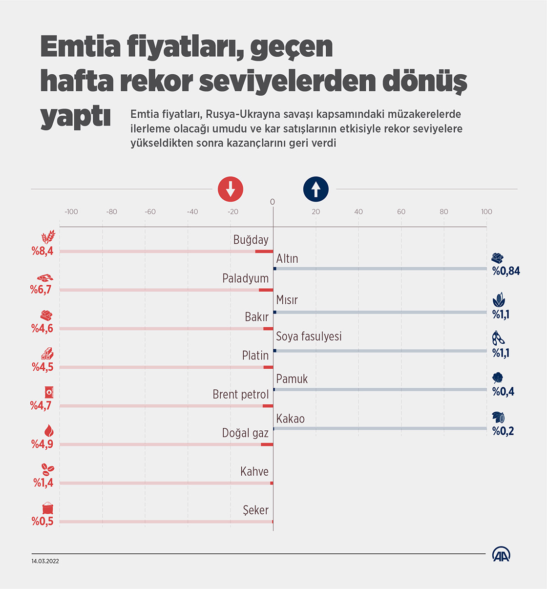 Emtia piyasalarında buğdayın fiyatı 13,6350 dolarla gördüğü tarihi zirvenin ardından kazançlarını geri vererek geçen haftayı yüzde 8,4 kayıpla tamamlarken, paladyum yüzde 6,7, bakır yüzde 4,6, Brent petrol yüzde 4,7 değer kaybetti.