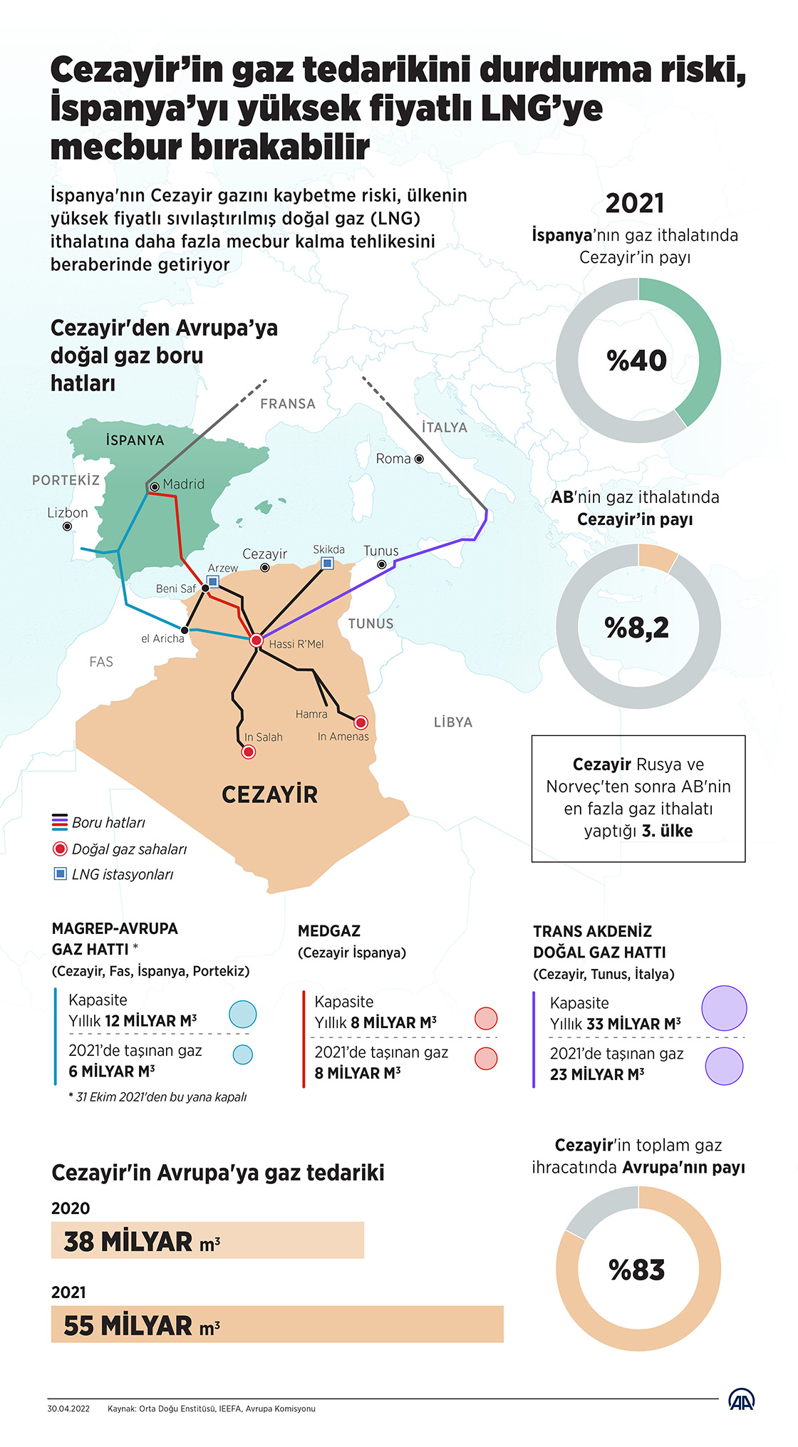 Orta Doğu Enstitüsü (MEI) verilerine göre, Cezayir'in toplam gaz ihracatında Avrupa'nın payı ise yüzde 83 oldu. Bu oranın yüzde 65'i sadece İspanya ve İtalya'ya gitti. Cezayir'in Avrupa'ya gaz tedariki 2021'de 55 milyar metreküpü buldu. Bu miktar 2020'de 38 milyar metreküp seviyesindeydi.