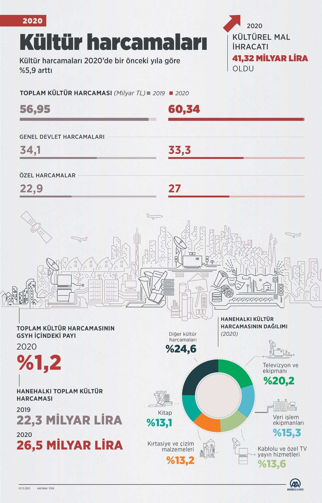 Buna göre, kültür harcamaları geçen yıl bir önceki yıla göre yüzde 5,9 artarak 60 milyar 346 milyon 102 bin liraya yükseldi.
