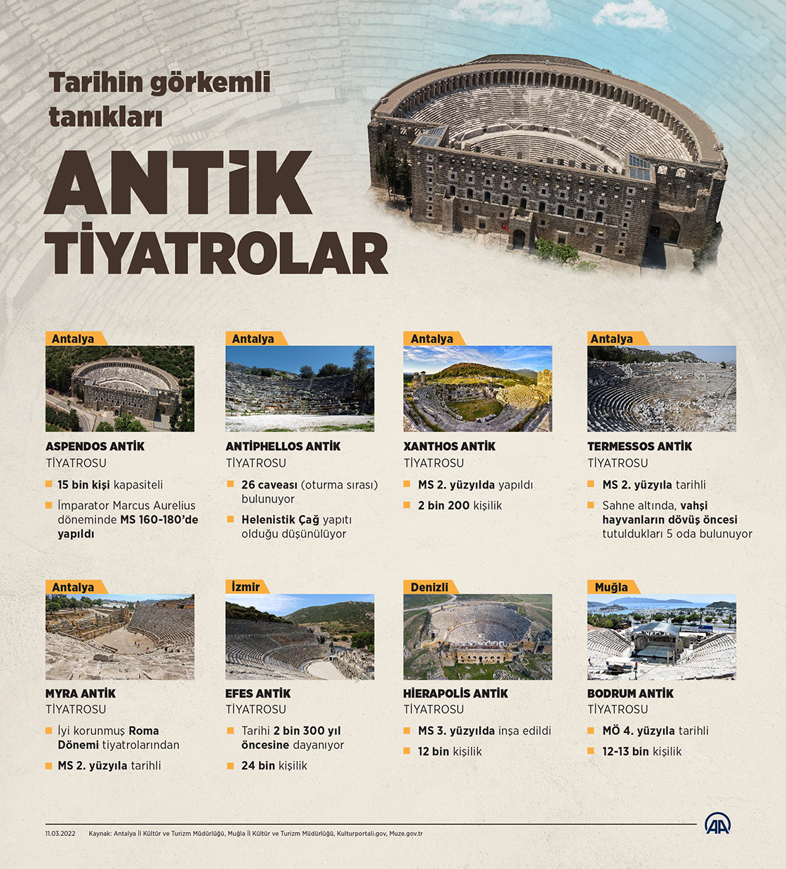 Medeniyetlerin toplumsal yaşamında estetik ve eğitici bir rol üstlenen tiyatro sahneleri, antik kentlerde sanatın güç bulduğu ihtişamlı mimari eserler olarak karşımıza çıkıyor. Eski medeniyetlerin destansı hikâyelerine sahne olmuş antik tiyatrolar, ziyaretçileri bekliyor.
