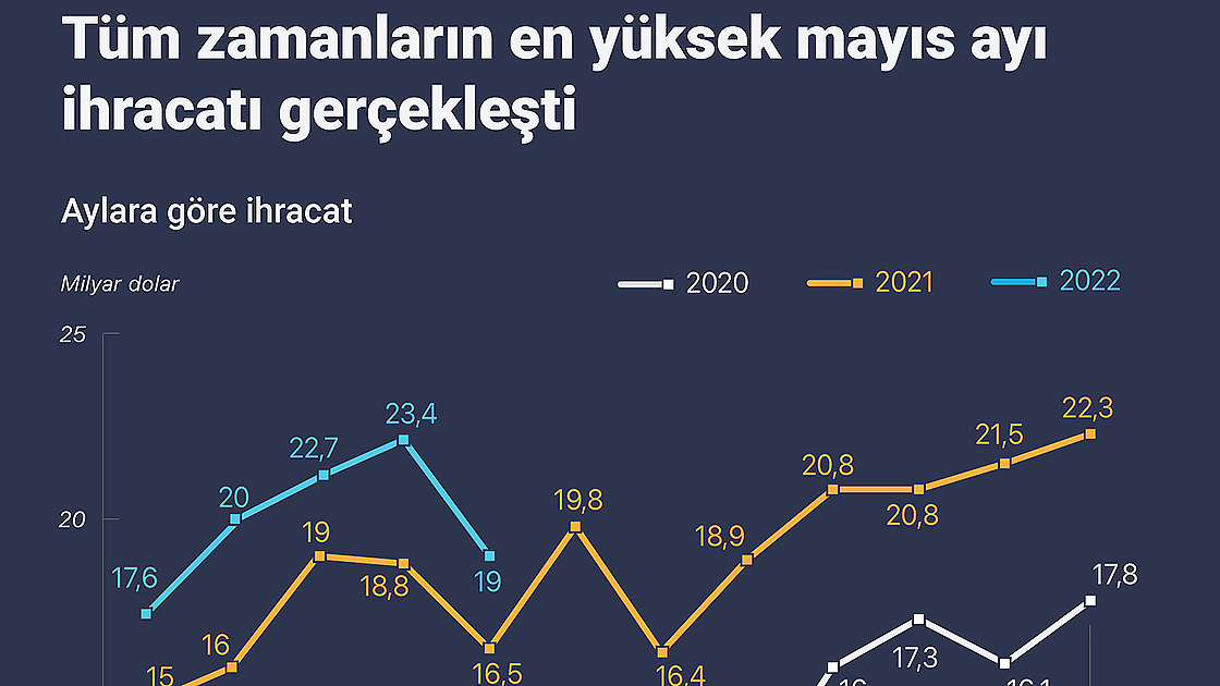 Ticaret Bakanı Mehmet Muş, mayısta ihracatın geçen yılın aynı ayına göre yüzde 15,2 artışla 19 milyar dolara ulaştığını belirterek, "Bu, tüm zamanların en yüksek mayıs ayı ihracatıdır. Böylelikle 2022 yılının ilk 5 ayının tamamında en yüksek aylık ihracat değerlerine ulaşarak ilk 5 ayda rekorlar kırmış olduk." dedi.