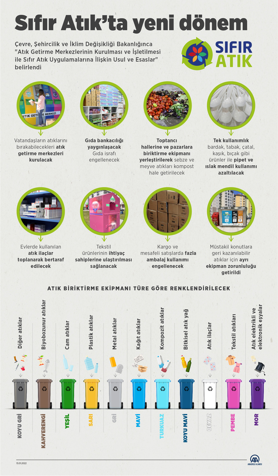 Çevre, Şehircilik ve İklim Değişikliği Bakanlığınca yayımlanan "Atık Getirme Merkezlerinin Kurulması ve İşletilmesi ile Sıfır Atık Uygulamalarına İlişkin Usul ve Esaslar" kapsamında, tek kullanımlık bardak, tabak gibi ürünler ile plastik kullanımının azaltılması amaçlanıyor.