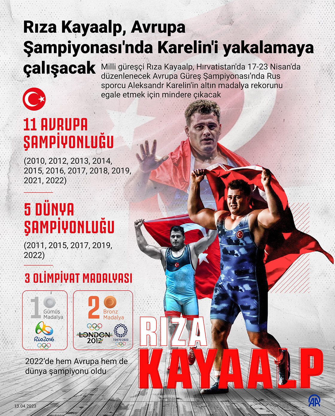 Milli güreşçi Rıza Kayaalp, Hırvatistan'da 17-23 Nisan'da düzenlenecek Avrupa Güreş Şampiyonası’nda Rus sporcu Aleksandr Karelin'in altın madalya rekorunu egale etmek için mindere çıkacak.
