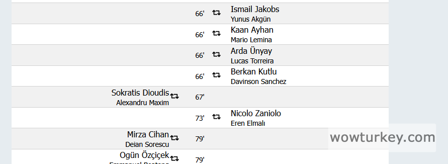 Oshimen bu maçta yer almadı, Sane onun yerine oynadı. 12. ve 45+12 (!?)'i dakikalarda Barış Alper 2 tane Eren Elmalı'da 16.dakika'da gol atmış. 66.Dakika'da 4 oyuncu değiştirmek'te tuhaf acaba Okan Buruk'un aklında ne var?