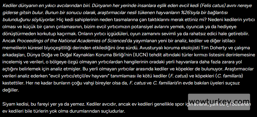 Takmışsın araştırın geline , araştırıyorum kedi evcil olanı da var yabani olanı da var bu hayvanlar avcı hayvanlar sokakta yaşamaları çok doğal ne gibi bi felakete yol açıyorlar onu da anlanadımOkudukça gülüyorum. Yazdıklarının tamamı şehir efsanesi. Bir araştırın gelin lütfen. Hepinize saygı duyuyorum. Sen hakaret etsen de bak cevap yazıyorum. Gerçeklerden kaçmayın. Hepinizin araştıracak kapasitesi var. Tek tek hepsine cevap vermek istemiyorum. Hiçbir medeni/gelişmiş ülkede böyle bir saçmalığa artık izin verilmemesinden bir çıkarım yapabilirsiniz.
