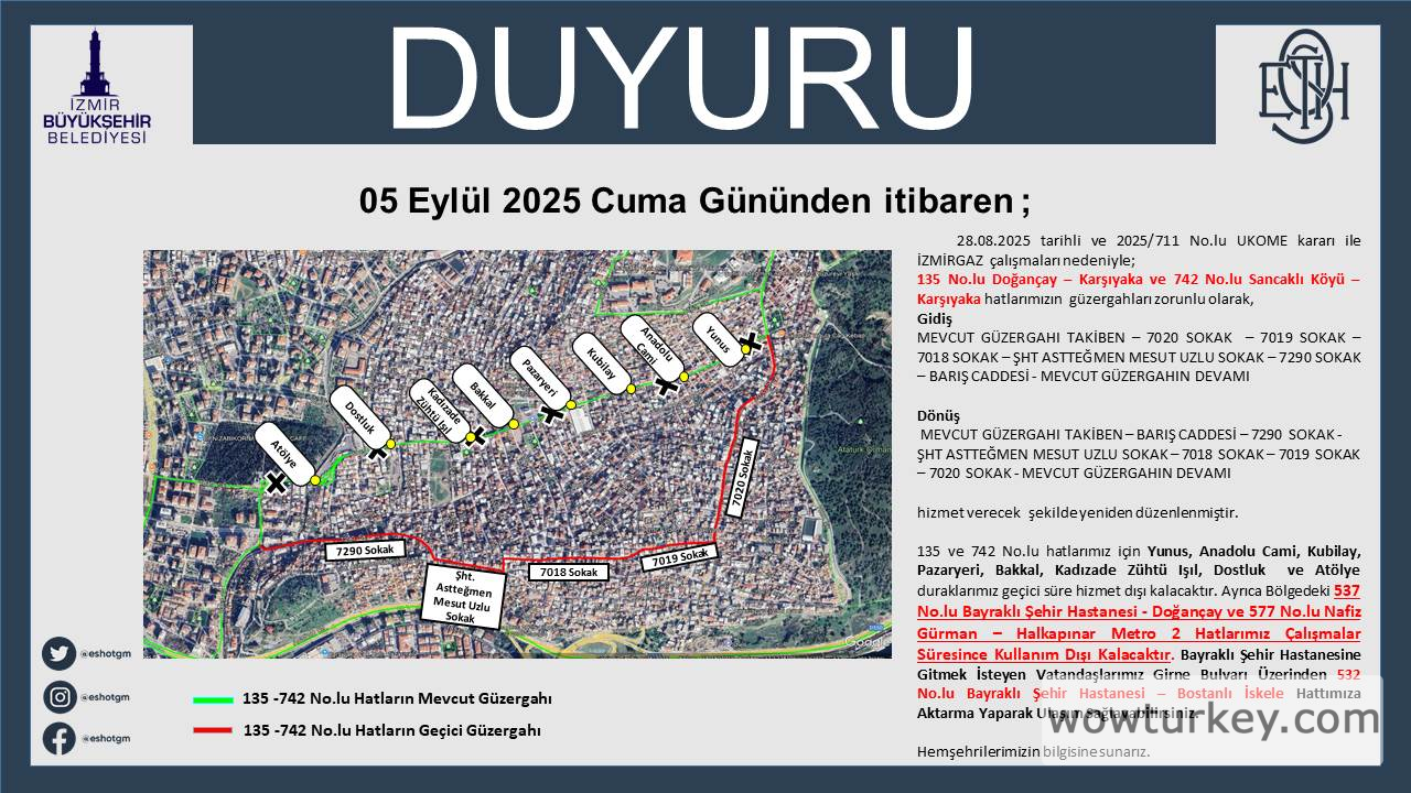 08 Eylül 2025 Pazartesi tarihinden itibaren geçerli olmak üzere; 536 No.lu Bayraklı Şehir Hastanesi-Şirinyer Aktarma Merkezi hattımız hizmete açılacaktır. Hattımız Ring Hat olarak hizmet verecek olup; Şirinyer Aktarma-Menderes Cd.-Uğur Mumcu Cd.-Özmen Cd.-63 Sk.-Doğuş Cd.-İzmir Çevre Yolu-Bayraklı Şehir Hastanesi güzergahlarını kullanacaktır.