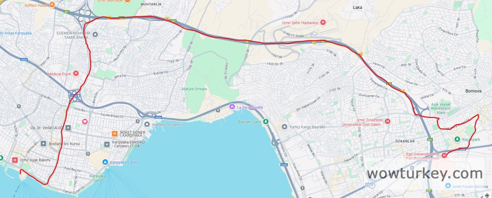 Güzergah: Girne Bulvarı - Çevre Yolu - Mustafa Kemal Caddesi - Bornova Merkez