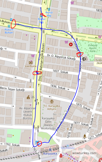 Peki hocam dönüşte güzergah nasıl olacak?Zübeyde Hanımdan sonra tekrar Remzi Bey Apartmanı yönüne Bahriye Üçok Bulvarına, sonra sola Ordu Sokağı, sağa Girne'den devam. Bayraklı-Bornova-Konak hatları Bahriye Üçok'tan sağa, Bahçelievler'den devam.