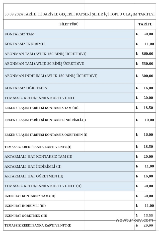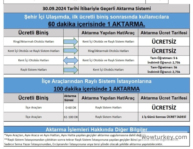 Kent içi otobüs hatlarından yine kent içi otobüs hatlarına veya raylı sisteme geçişlerde Tam bilet ve öğretmen bileti sahipleri 6,25₺ , indirimli kart sahipleri 3,45₺ verecek.