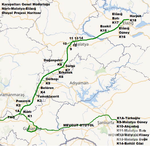 karayollarının Bazı Yolları Çukurdan Geçilmiyor. Bi Asfaltını yenileyemiyor çevre yolunun. duble yolların bazıları mıcır yol!Narlı-Malatya-Elâzığ arasında yapılması plânlanan ve 281 km uzunluğunda olacak Otoyol Projesinde 18 Kavşak, 20 Viyadük, 12 Tünel, 6 Hizmet Tesisi olması plânlanmaktadır, Projenin 2030 yılında bitirlimesi öngörülmektedir