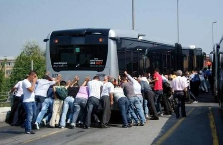 Vay be... Eskiden yol yardım yokken böyleymiş. Şimdi hemen yol yardım geliyor. (Ford F-Max)Arıza yapan Mercedes Capacity metrobüsü vatandaşlar ittirirken. Görsel 2010 yılına ait.