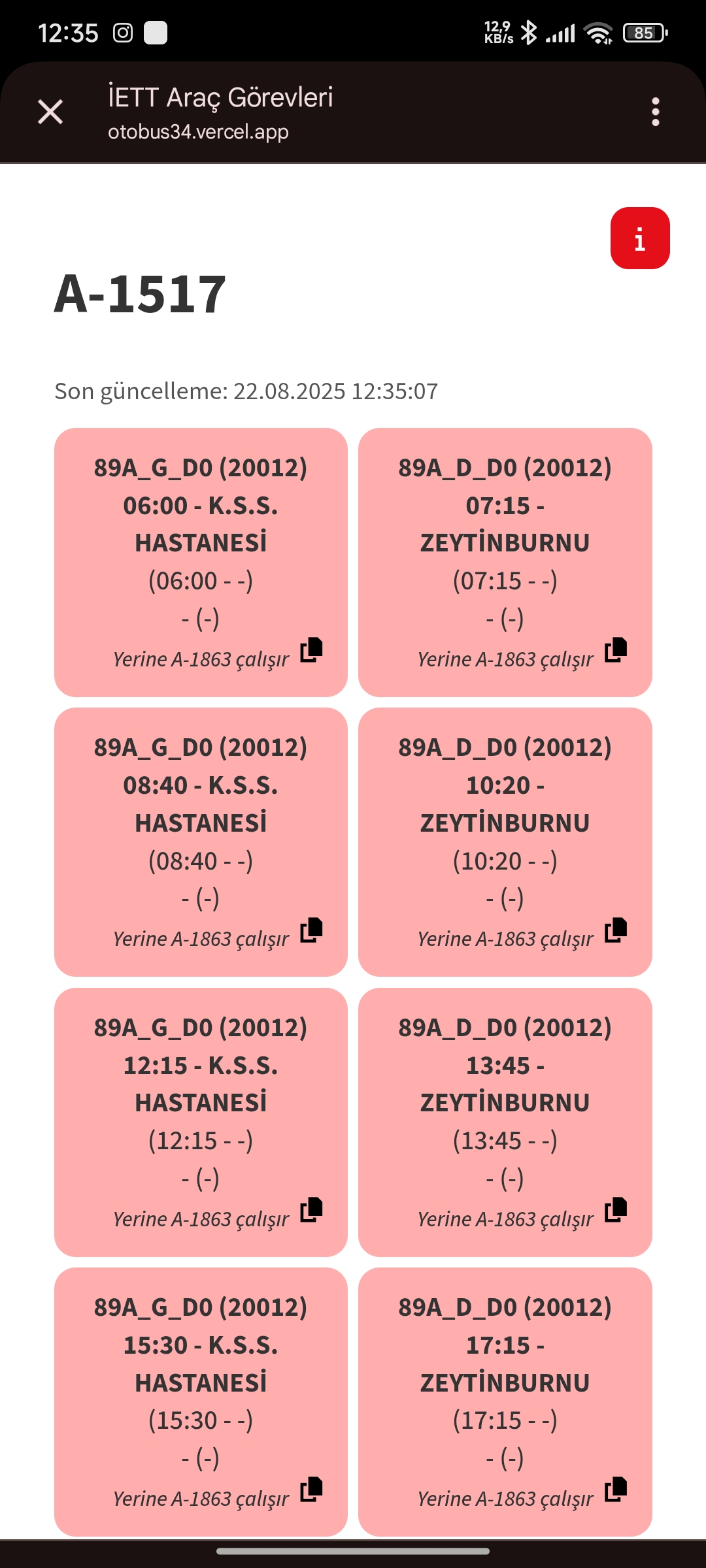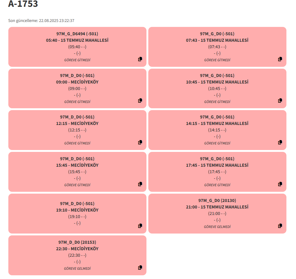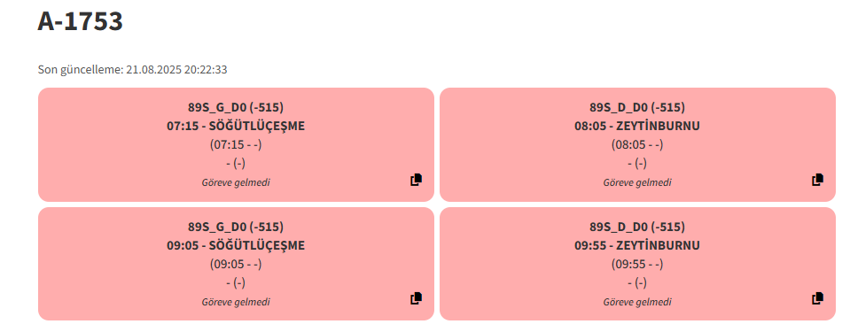 A-1753'ün gece seferleri için yerine 89S'ye T1040 verilmişEvet A-1753 bugün de motor arızasından sonra göreve gelmemiş. 2025 model araç baya şansız başladı. Hem göreve gelmemiş hem de sinyali bir gün öncede kalmış. Araç cidden şansız