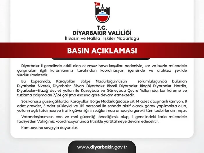 Karla mücadeleye ilişkin açıklama yapan Diyarbakır Büyükşehir Belediyesi, meteoroloji verilerine göre kar yağışının etkisini artırmasının ve buzlanma riskinin devam etmesinin beklendiğini belirterek, can ve mal güvenliğinin korunması amacıyla yurttaşlara uyarılarda bulundu.