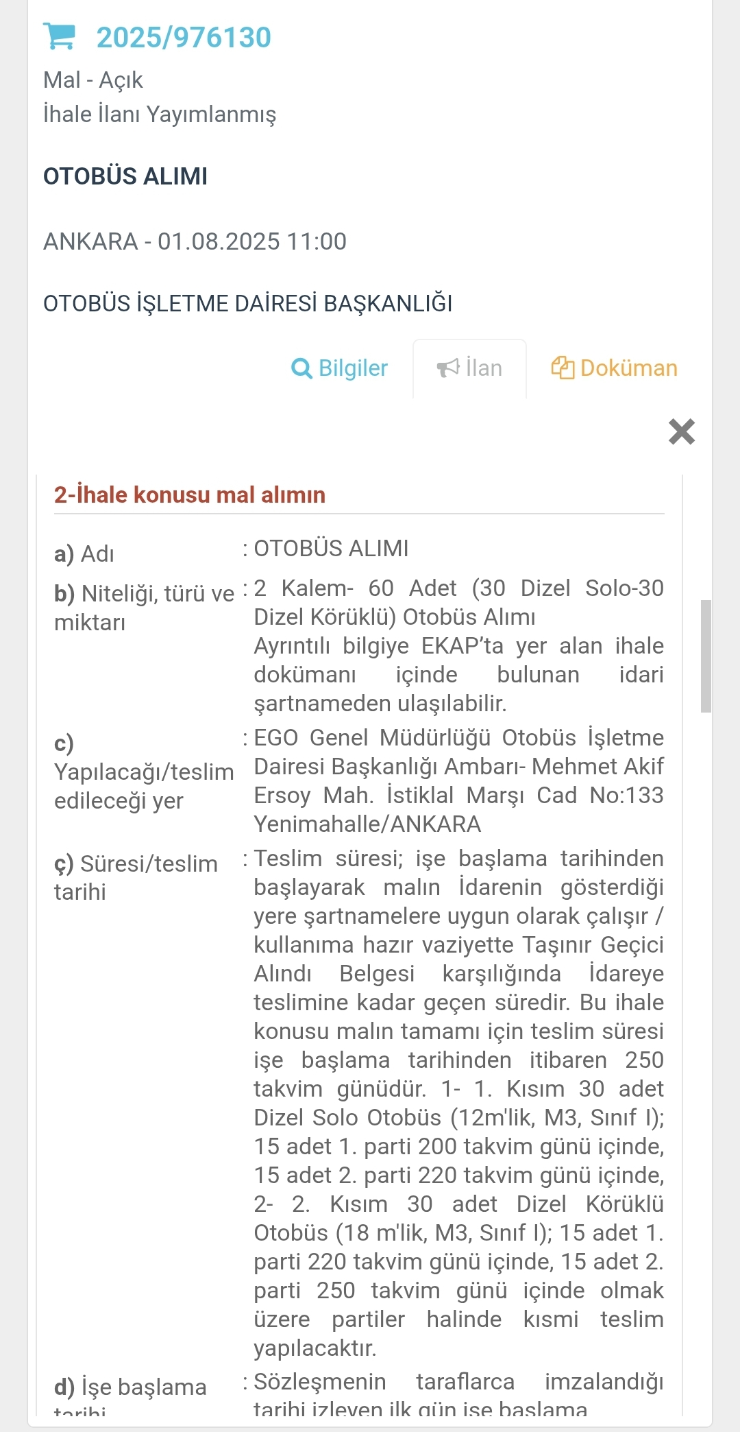 Biz hala alamiyoruz birsey Cok sinirlemeim suan ESHOTA biz burda bir otobus bekliyoz belde conectolar proyangincityler cirit atiyor yetti be bu araad aktif ankarali varsa sizi cok kotu bir sey bekliyor habeeiniz olsun.Ego 1 Ağustos'ta saat 11.00 da 30 adeti solo 30 adeti körüklü olacak şekilde 60 adet dizel otobüs ihalesi yapacakmış. EKAP da yayınlanmış. Şimdiden hayırlı olsunEkli dosyayı görüntüle 74124Ekli dosyayı görüntüle 74125