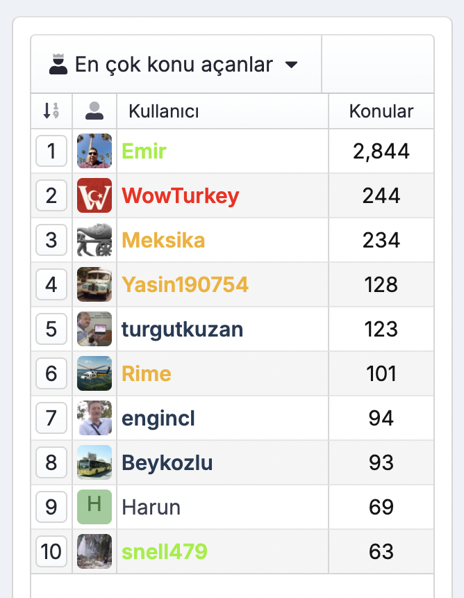 Üye istatistikleri alanında birazda en çok konu açan üyelere yer verdik. Onlarında emekleri çok forumda. @Emir @Meksika @Yasin190754 @turgutkuzan @Rime @engincl @Beykozlu @Harun @snell479 emekleriniz için teşekkür ederim.