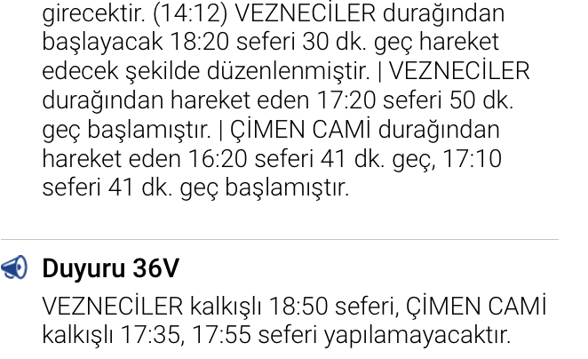 VEZNECİLER durağından başlayacak 20:35 seferi 15 dk. geç, 20:45 seferi 15 dk. geç, 20:55 seferi 15 dk. geç, 21:10 seferi 10 dk. geç hareket edecek şekilde düzenlenmiştir. | VEZNECİLER durağından hareket eden 20:15 seferi 15 dk. geç, 20:26 seferi 13 dk. geç başlamıştır.
