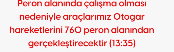 Yoğun Trafik nedeniyle araçlarımız KADIKÖY kalkışlı seferlerine .15 dakika ve üzeri rötarlı hareket etmektedir. (17:53) | Güzergah üzerindeki Parklanma ve trafik yoğunluğu nedeniyle güzergah değişikliği yapılmıştır. Hattımızın otobüsleri ŞİFASONDURAK yönüne doğru DR.LÜTFİ KIRDAR ŞEHİR HASTANESİ durağından güzergah dışına çıkarak KARTAL BÖLGE TRAFİK Durağından güzergaha girecektir. (11:49) | Güzergah üzerindeki Altyapı Çalışması nedeniyle güzergah değişikliği yapılmıştır. Hattımızın otobüsleri KADIKÖY yönüne doğru HASTANE durağından güzergah dışına çıkarak İSTANBUL MEDENİYET ÜNİVERSİTESİ Durağından güzergaha girecektir. (11:00) KADIKÖY durağından başlayacak 21:11 seferi 29 dk. geç, 21:18 seferi 27 dk. geç, 21:25 seferi 25 dk. geç, 21:32 seferi 23 dk. geç, 21:40 seferi 20 dk. geç, 21:48 seferi 17 dk. geç hareket edecek şekilde düzenlenmiştir. | ŞİFA SONDURAK durağından başlayacak 21:10 seferi 6 dk. geç hareket edecek şekilde düzenlenmiştir. | KADIKÖY durağından hareket eden 18:58 seferi 48 dk. geç, 19:05 seferi 59 dk. geç, 19:12 seferi 60 dk. geç, 19:19 seferi 57 dk. geç, 19:26 seferi 55 dk. geç, 19:33 seferi 53 dk. geç, 19:40 seferi 52 dk. geç, 19:47 seferi 49 dk. geç, 19:54 seferi 47 dk. geç, 20:01 seferi 46 dk. geç, 20:08 seferi 44 dk. geç, 20:15 seferi 41 dk. geç, 20:22 seferi 38 dk. geç, 20:29 seferi 42 dk. geç başlamıştır. | ŞİFA SONDURAK durağından hareket eden 19:42 seferi 19 dk. geç, 19:50 seferi 22 dk. geç, 19:58 seferi 40 dk. geç, 20:06 seferi 34 dk. geç, 20:14 seferi 35 dk. geç, 20:22 seferi 30 dk. geç, 20:30 seferi 26 dk. geç, 20:40 seferi 21 dk. geç, 20:50 seferi 16 dk. geç, 21:00 seferi 12 dk. geç başlamıştır.