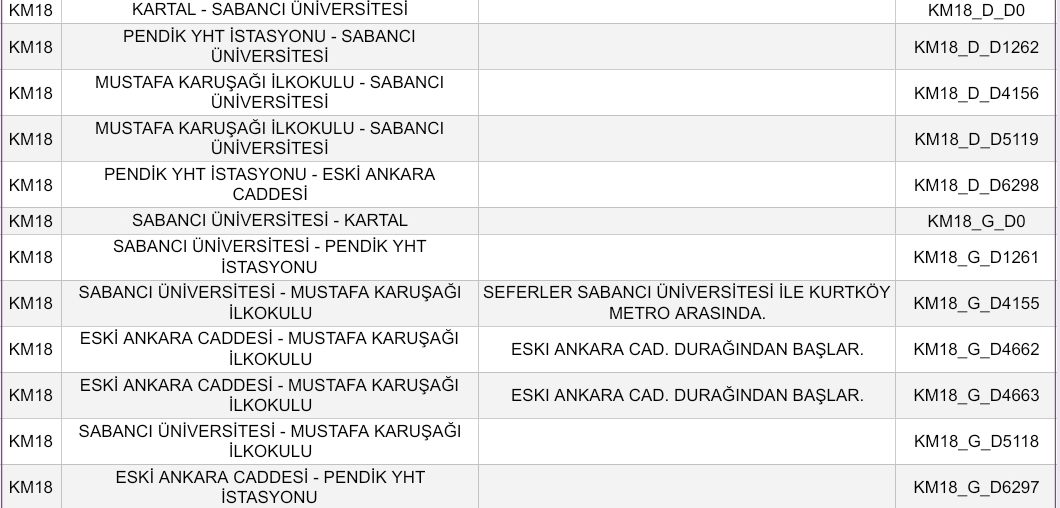 Biraz araştırma sonucunda buldum kısaltılmadan önceki halini. https://www.haberturk.com/iett-sefer-saatleri/KM18-otobus-kalkis-saatleri-ve-duraklariEskiden Kartal'a kadar da gidiyormuş sanırım.