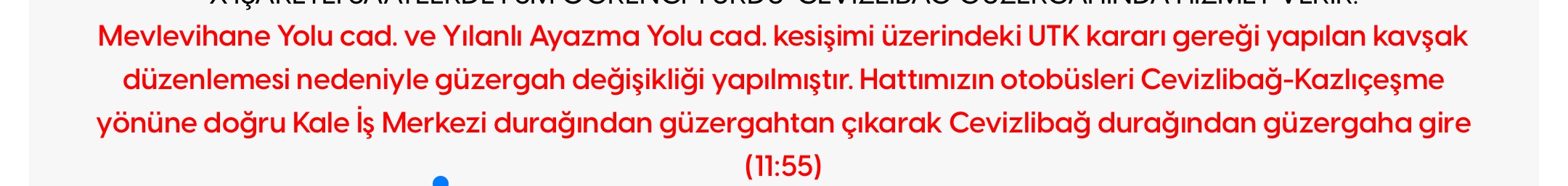 Yoğun Trafik nedeniyle araçlarımız seferlerine 15 dakika ve üzeri rötarlı hareket etmektedir. (16:48) KARTAL METRO durağından başlayacak 18:15 seferi 15 dk. geç hareket edecek şekilde düzenlenmiştir. | KARTAL METRO durağından hareket eden 17:00 seferi 21 dk. geç, 17:25 seferi 11 dk. geç başlamıştır.