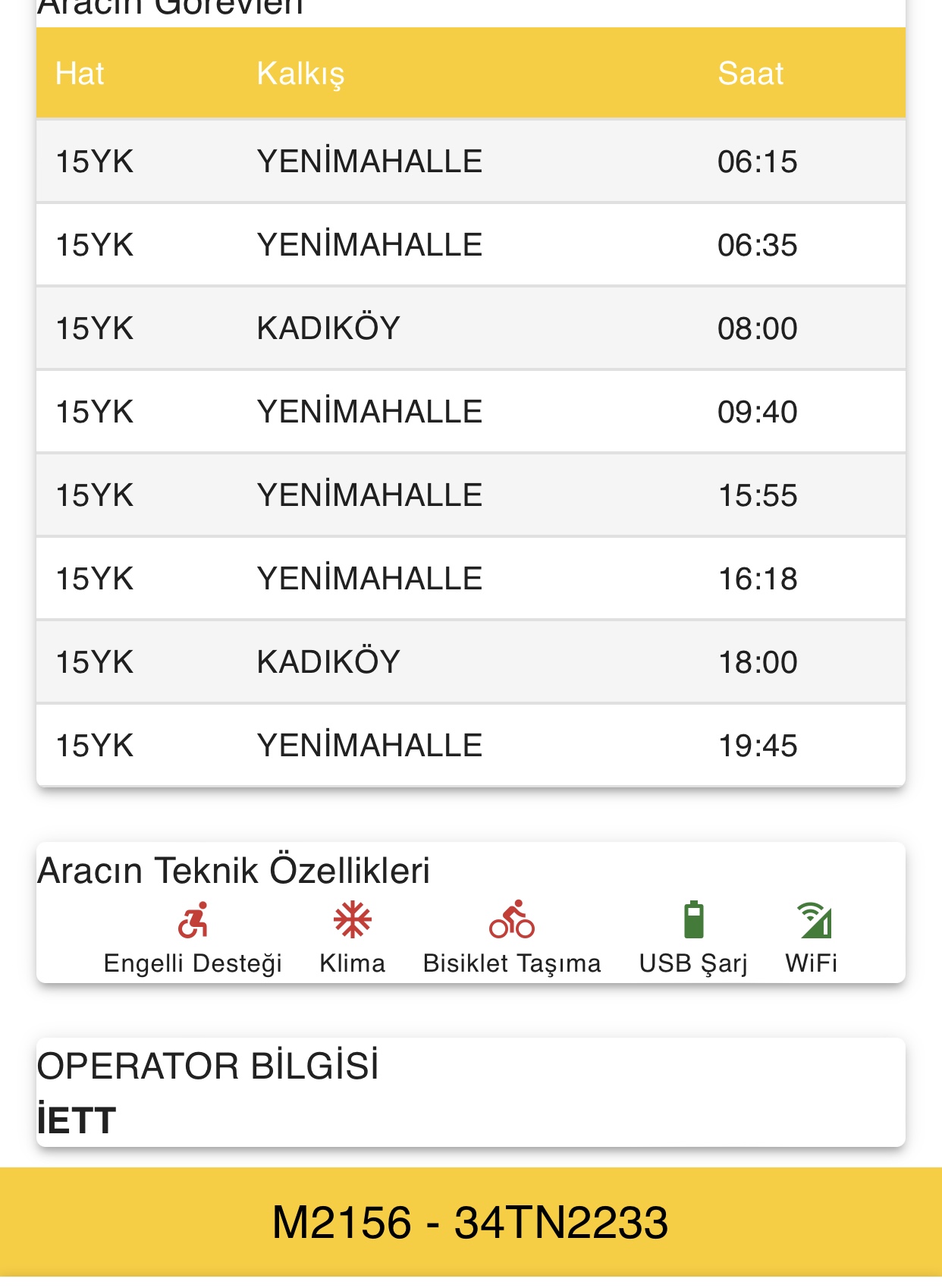 Gün boyu sefer gözüküyor diye ben de öyle zannediyordum eskiden, ama öyle değilmiş. Şimdi araç 6.15'te garajdan çıkıyor ve ilk durağına Yenimahalle'ye gidiyor, 6.35'te kalkıp Kadıköy'den de 8.00'de kalkıyor. 9.40'da garaja yatmaya çekiliyor, 15.55'e kadar garajda yatıp, 15.55'de garajdan çıkıyor. 16.18'de Yenimahalle'den kalkıp, 18.00'de de Kadıköy'den kalkıp, 19.45'de Şahinkaya garajına giriyor. Yani araç günde 2 kere 6.35 ve 16.18 olmak üzere Yenimahalle'den 2 kere de 8.00 ve 18.00 olmak üzere Kadıköy'den kalkıp toplam 4 sefer yapıyor.Ekli dosyayı görüntüle 59258hattın sadece 1 sabah 1 akşam seferi olmasına rağmen sistemde gün boyu sefer gözüküyor