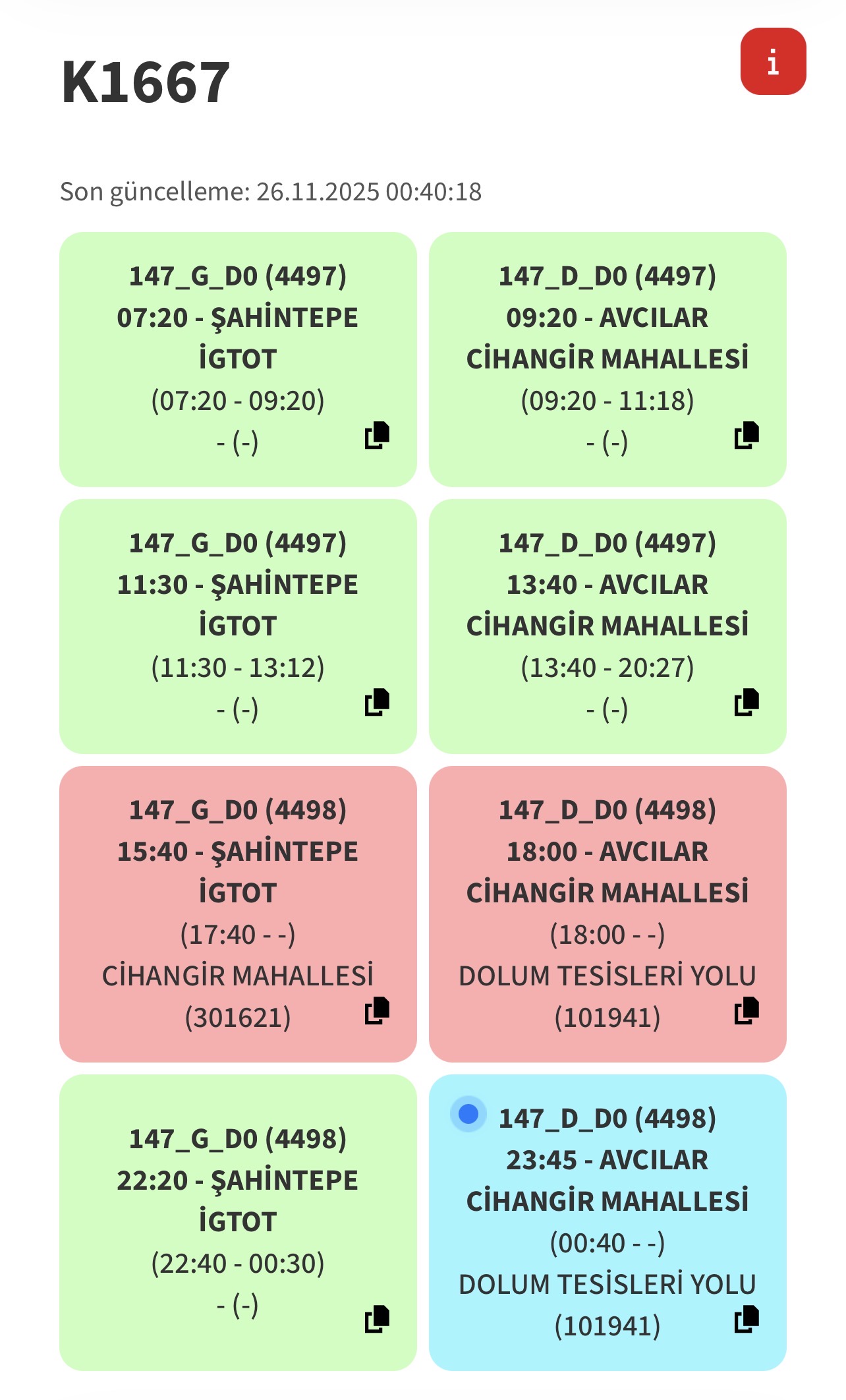 İş gidiş-çıkış saatleri dışında çoğu hattın sefer süresi sitedekiyle örtüşüyor. 147’nin sadece durak sayısı bile 72. Yani araç trafiksiz ve yolcusuz senaryoda bile o güzergahta 69 dakikada seferi tamamlayamazSitede hatların sefer süresi, trafiğin neredeyse hiç olmadığı saatlere göre yazılıyor oldu bitti. O yüzden 147’nin de 69 dk sürmesi, hatta bundan daha kısa sürmesi gayet normal özellikle son seferlerde. Pratikte rastlanan bir durum.