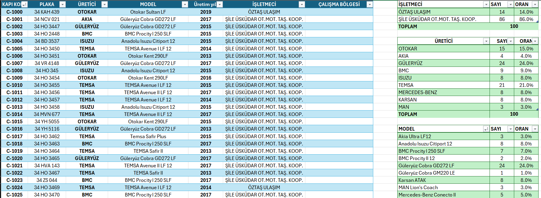 Akşamdan sonra da C-XXX ( 3 rakamlı ) kapı numaralı araçlardan C-400'e kadar olan kısmı topladım.Tabloya C-15XX, C-16XX ve C-17XX kapı numaralı araçları da dahil ettim. Sağ kısımda yine oranlar yer almaktadır. Listemde hatalar olabilir. Bunun için ister forumdan ister E-Tablolar üzerinden bildirimde bulunabilirsiniz.