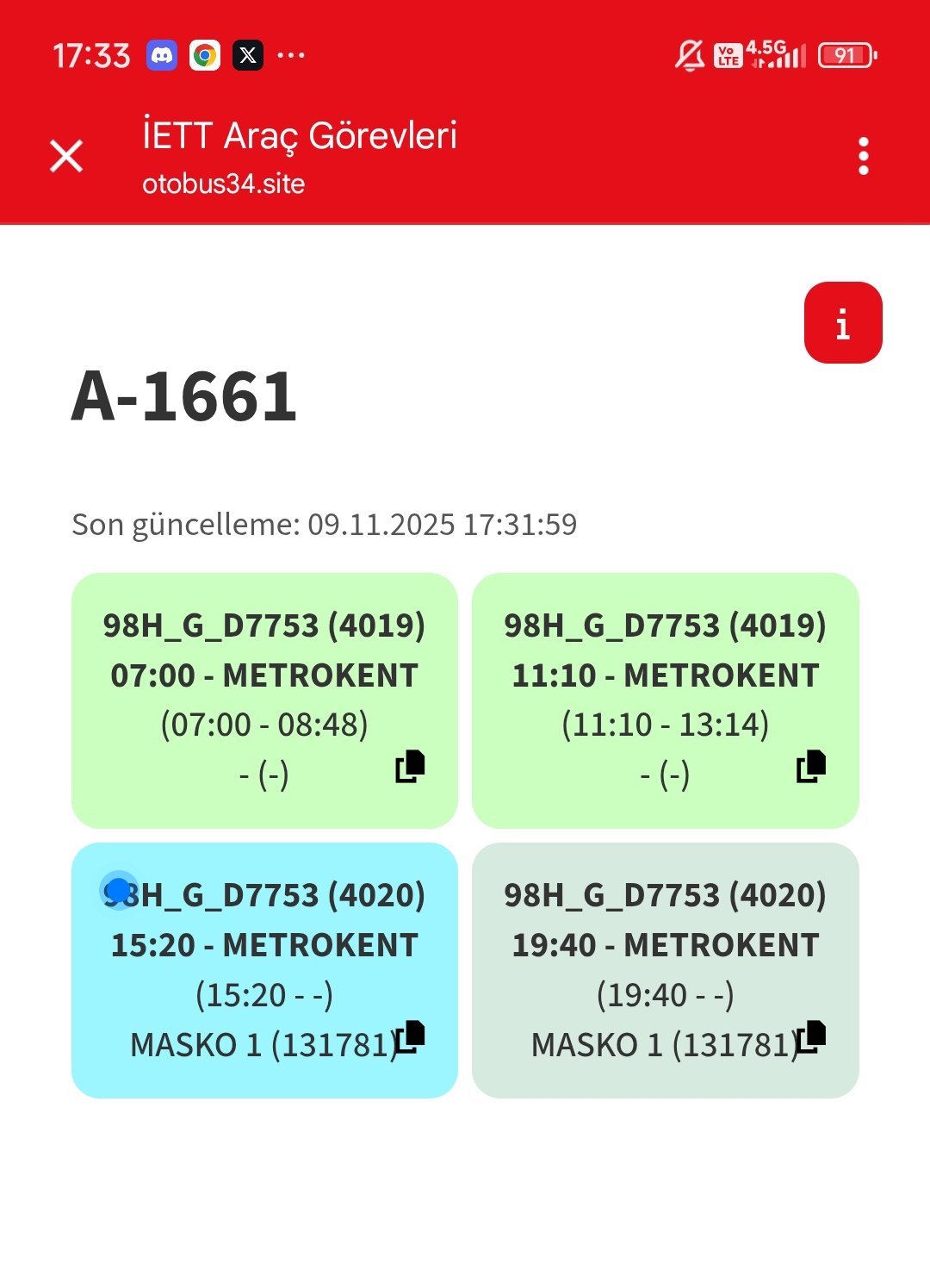 Avenue Plus olarak A-1840, A-1879 ve B-1799'u biliyordum demek ki bu civardaki sayıları 4 taneymişVe 2 aracı da 98H hattından alıyor.HT11 Cumartesileri 1 araç 92Ş/98H, diğer aracı da 97GE,89K,141M,98H bölgesinden,Pazarları ise 2 aracı da 97GE,89K,141M,98H bölgesinden alıyor.A-1725 ile birlikte A-1831 de HT11’de çalışıyor bugün.İkisi de 98H hattından geçme.Bu yüzden A-1725 bi an için Yasin’e yabancı gelmiş olabilir.![]()