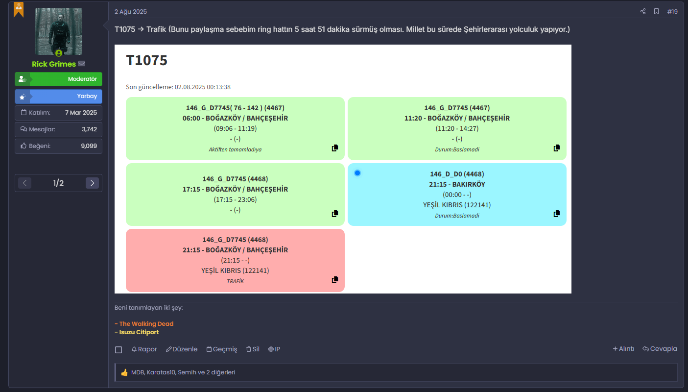 Sonuç olarak 89S'nin 19:05 - 20:40 arası tüm Söğütlüçeşme kalkışlı seferleri trafikten iptal oldu