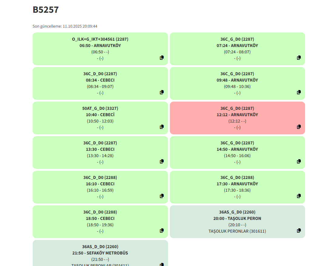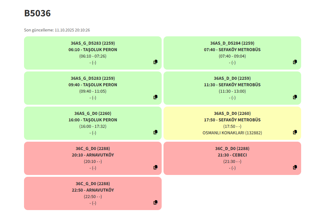 Arıza mesajını görünce Mart'ta attığım üstteki mesajım aklıma geldi ne günlerdi benim için36AS'de Taşoluk Peronlara 3 durak kala bozulan B5036 yerine o an 36C için Arnavutköy Peronlarda olan B5257 verildi. Aracın Arnavutköyden Taşoluk Peronlara gitmesinden dolayı 20:00 seferi 10 dakika rötarlı kalktı. "TAŞOLUK PERONLAR durağından başlayacak 20:00 seferi 10 dk. geç hareket edecek şekilde düzenlenmiştir."