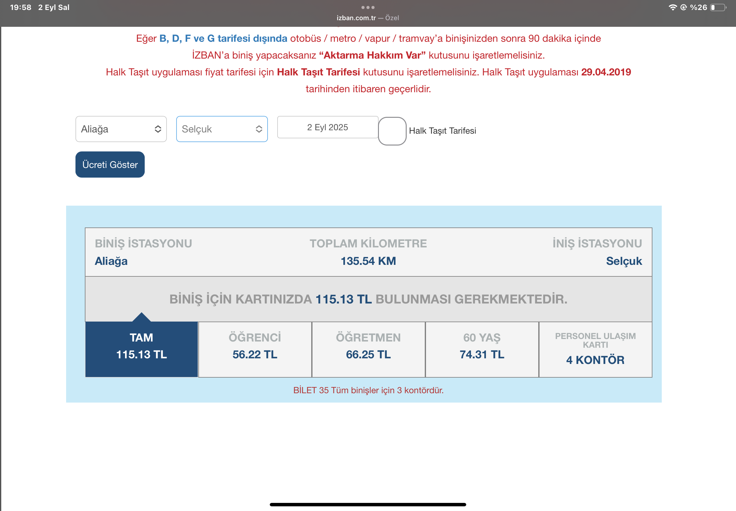 Ekli dosyayı görüntüle 79976önceden tepeköyden sonraki durakları seçip fiyat hesaplamaya çalışırken olmuyordu tepeköyden aktarma yapmalısınız gibi bir uyarı geliyordu (bulursam onuda koyacağım) şuan aliağadan selçuğa fiyat hesaplanabiliyor acaba başlıyormu Aliağa-Selçuk seferleri