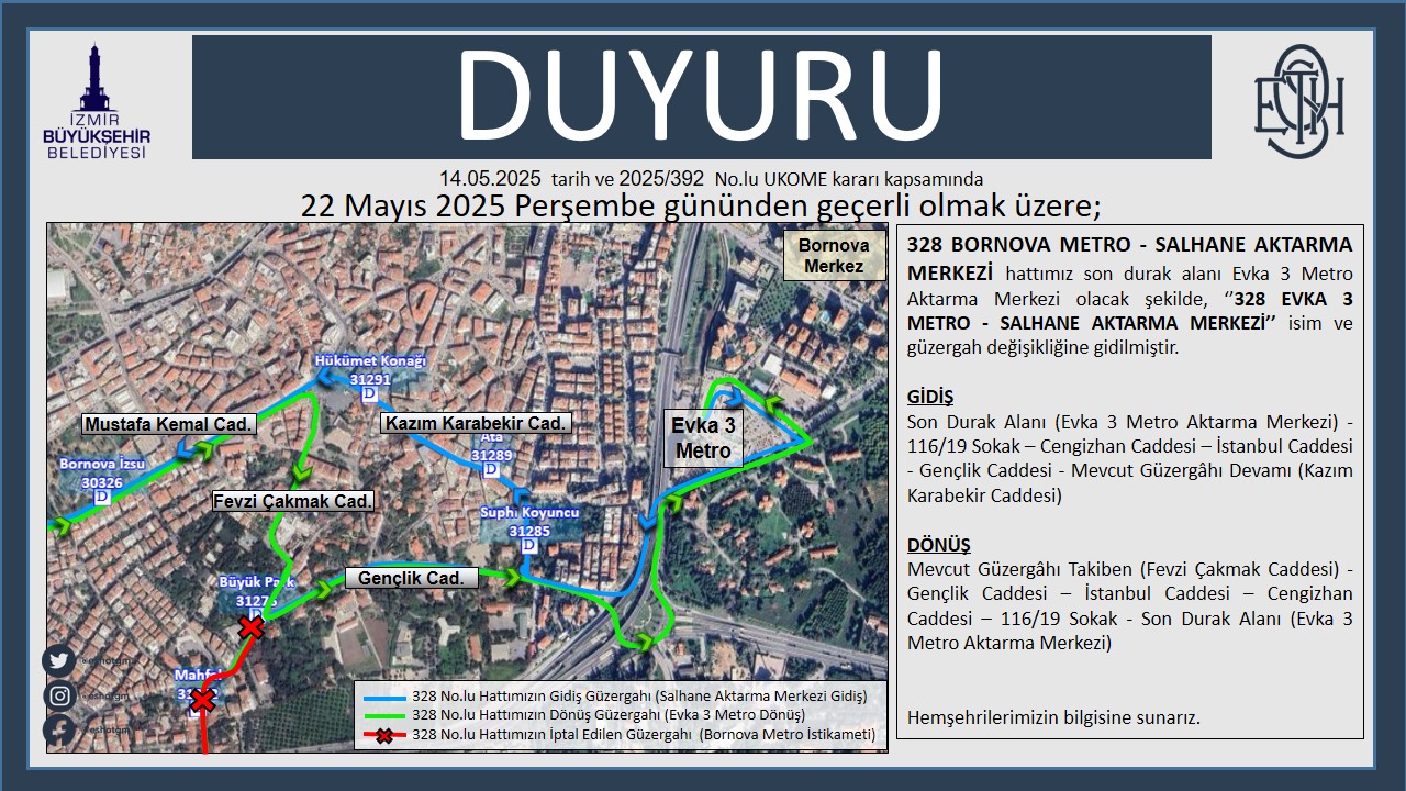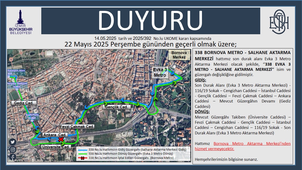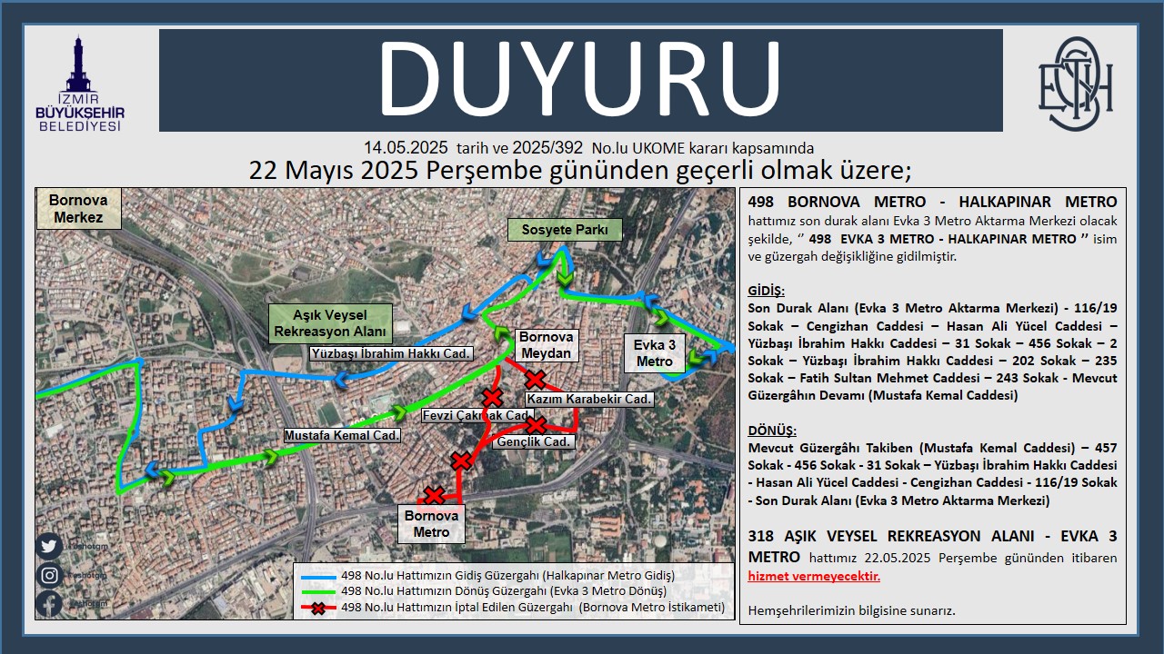 Böylece Çamkıran ve Adliyeye doğruki duraklardan Bornova Metroya hat yok komik338, 328 ve 498 artık evka3den başlayacak ve 318 hattı 22 mayıs günü iptal oluyor.