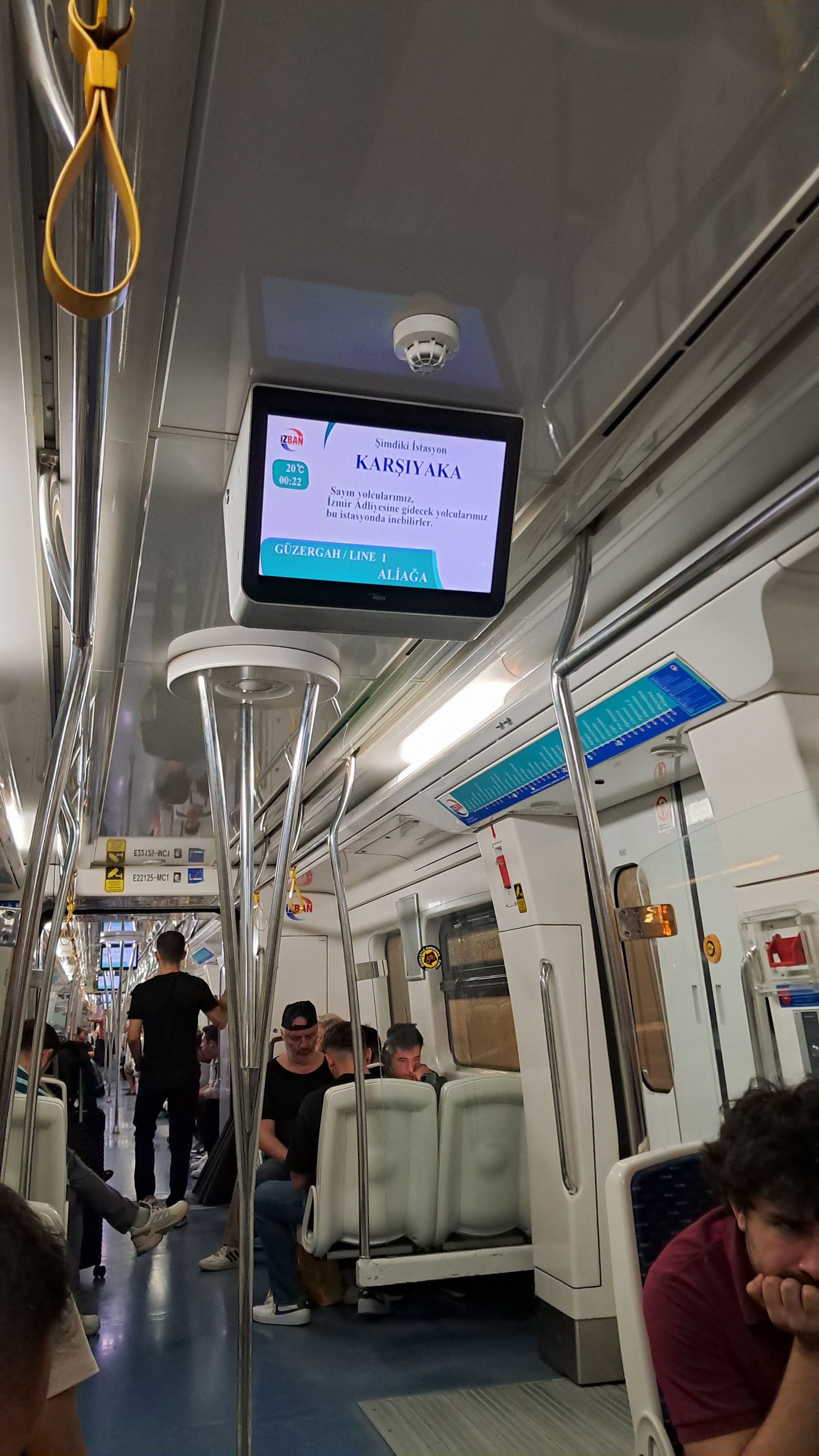 İzbanda Bayraklı istasyonuna geldiğimde ekranda Karşıyaka yazıyordu ve adliyeye gidecek yolcular bu durakta inebilir yazıyordu bu diğer duraklarla da devam etti Turan'dayken Nergiz yazdı sonra tekrar Karşıyaka yazdı bu yüzden şaşırıp yanlış inenler oldu şu anda da Şemikler'e geldiğim halde Demirköprü yazıyor ve altında da adliye yazısı hala var.