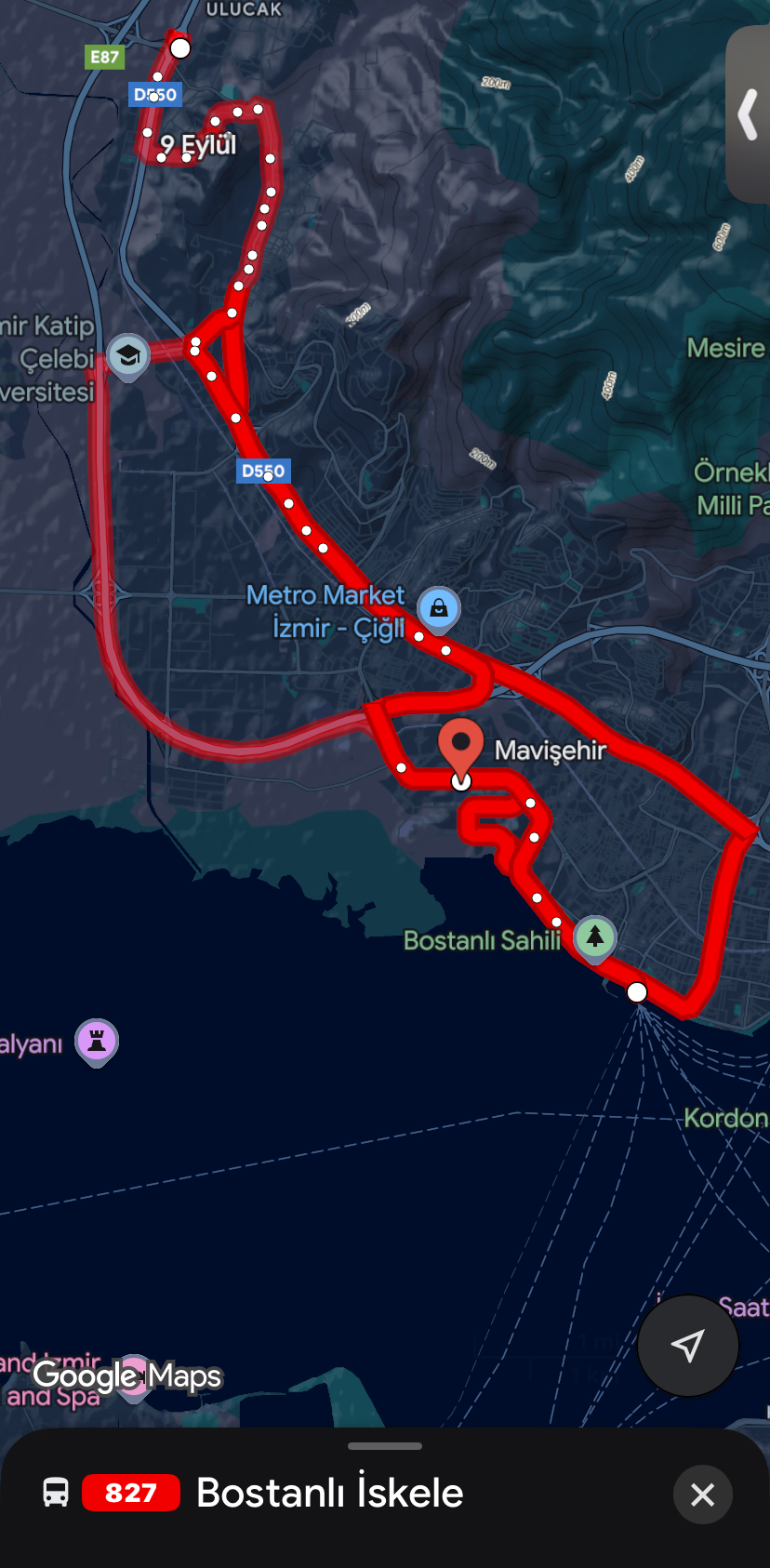 827 nin güzergahı eshot sitesindede google maps dede yanlış görünüyor google mapste çoğu hattın güzergahı yanlış zaten