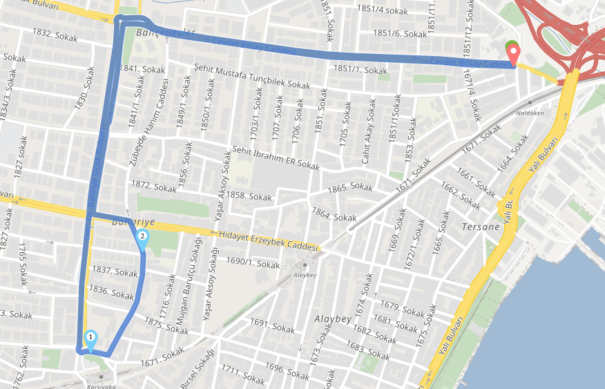 Orası tek yön, o yüzden çok sorun olmaz, ayrıca Zübeyde Hanım Sokağı üzerinde durak öngörmedim. Zübeyde Hanımdan sonra tekrar Remzi Bey Apartmanı yönüne Bahriye Üçok Bulvarına, sonra sola Ordu Sokağı, sağa Girne'den devam. Bayraklı-Bornova-Konak hatları Bahriye Üçok'tan sağa, Bahçelievler'den devam.Öyle, ondan dolayı güzergahı doğru mu anlamadım diye emin olamadım