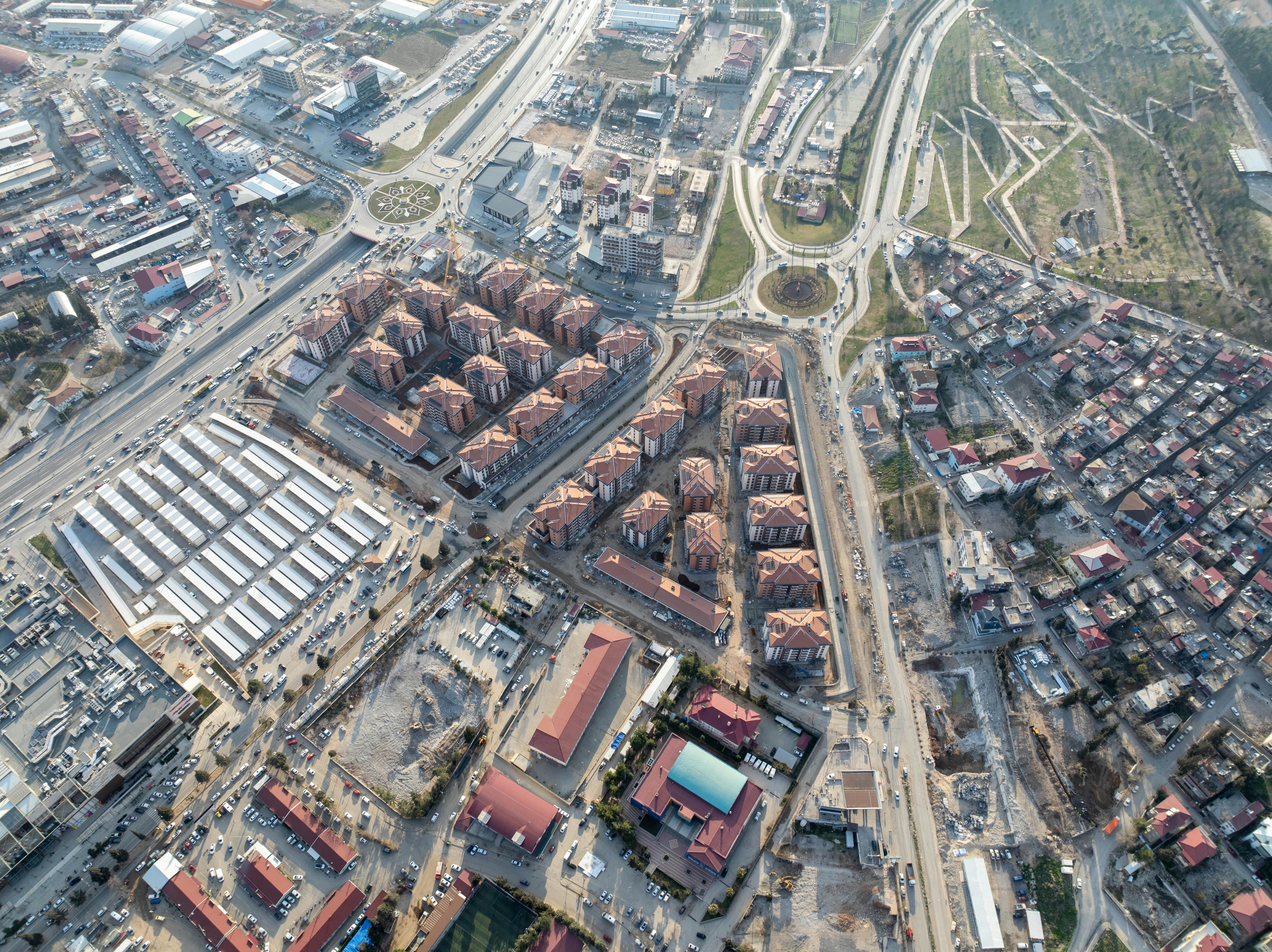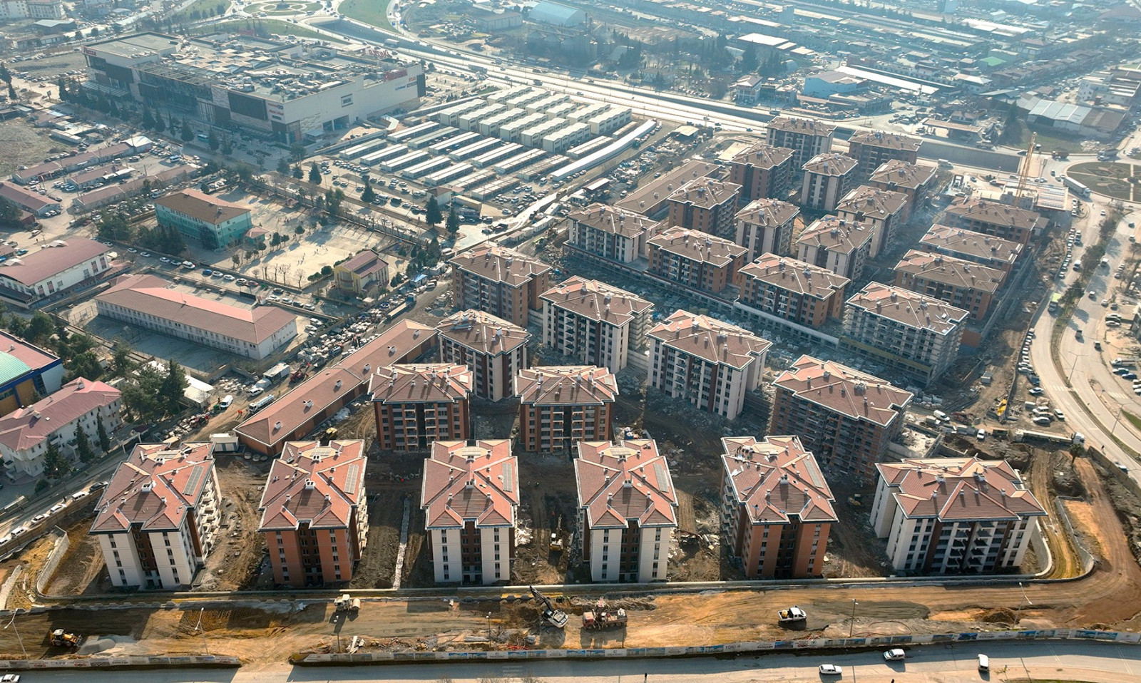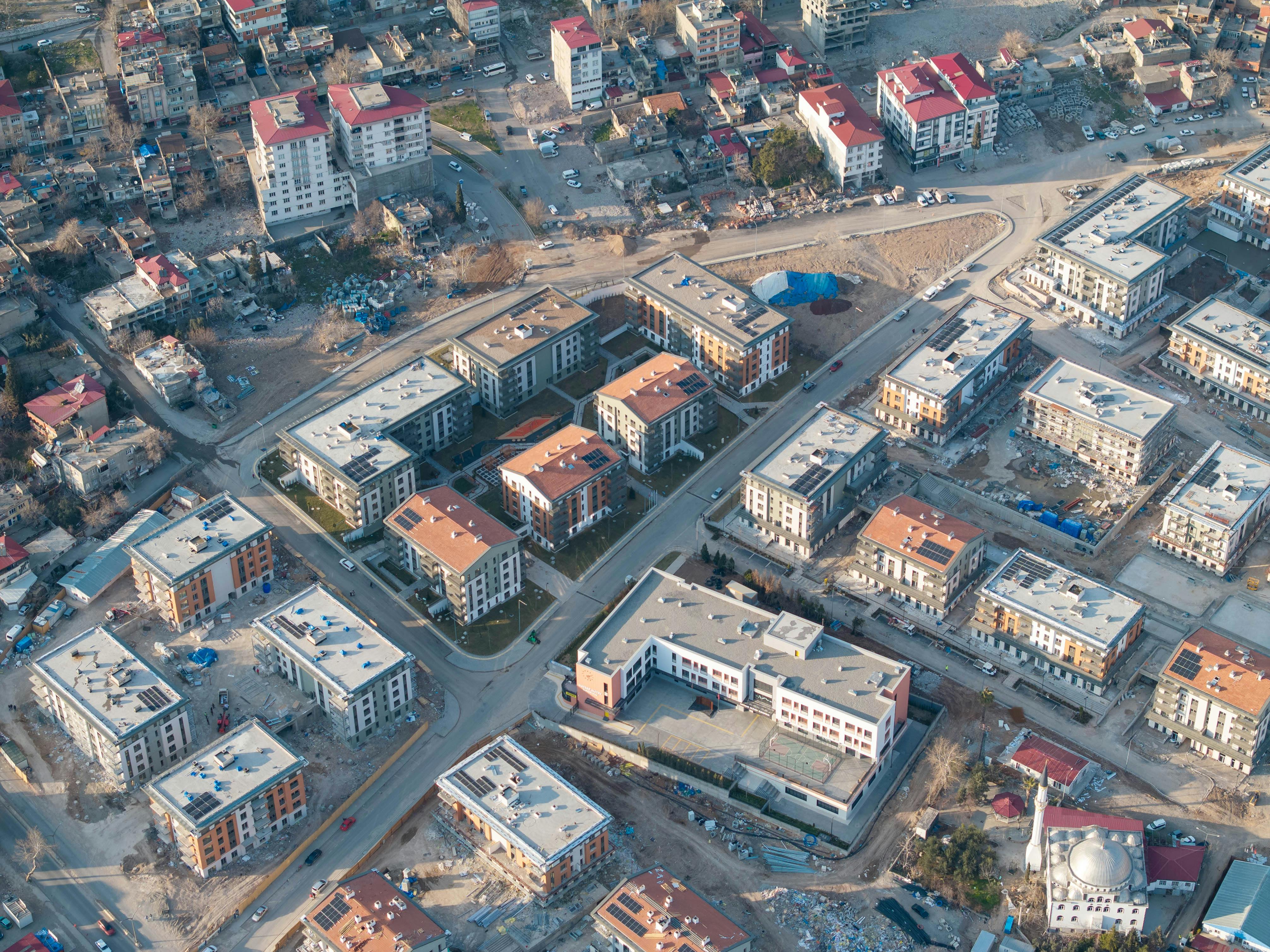 Kurtlar TOKİ (Çatısız konutlar depremden önce yapıldı), arkası çatılı Baykar Konutları, en geride gözüken Önsen TOKİ