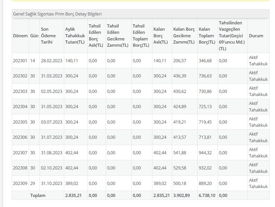Fakat 18.01.2023 ile okul kaydımın yapıldığı 01.11.2023 tarihleri arasında kalan kısmı ödemem gerektiğini söylediler. 2.835,21 TL'lik borç ise haberim olmadığı için 6.738,10 gibi çok yüksek faizli miktara kadar yükselmiş bulunmakta. Bu tarihler ve günümüze kadar hiç sigortalı işte çalışmadım.