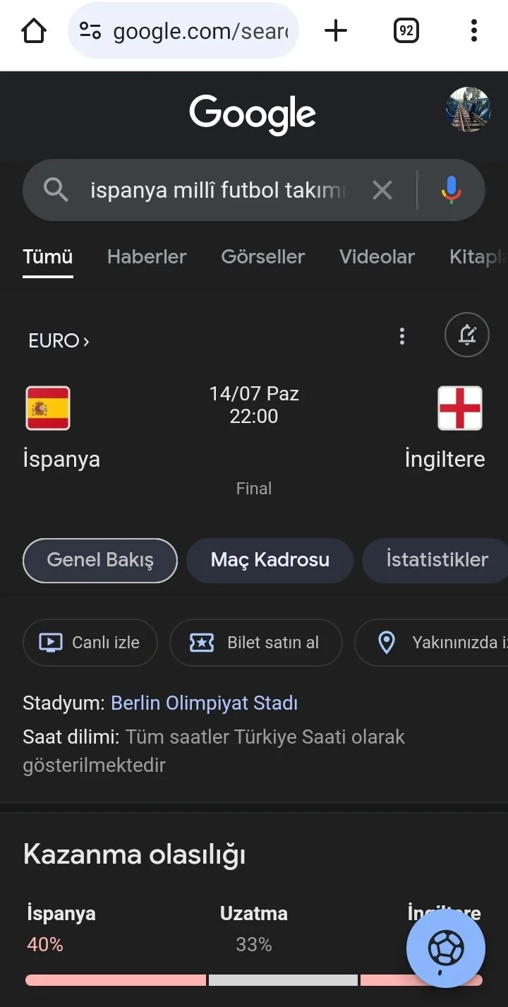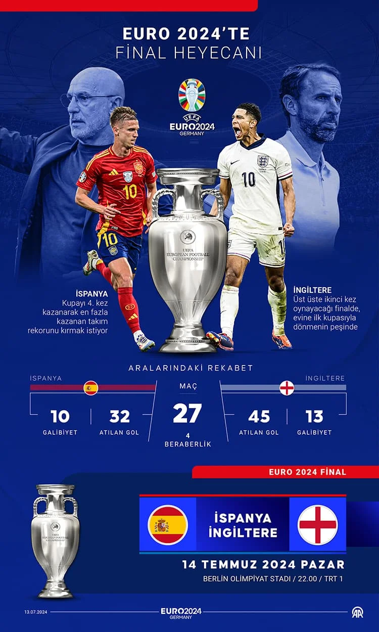 2024 Avrupa Futbol Şampiyonası (EURO 2024) finalinde yarın İspanya ile İngiltere karşılaşacak.