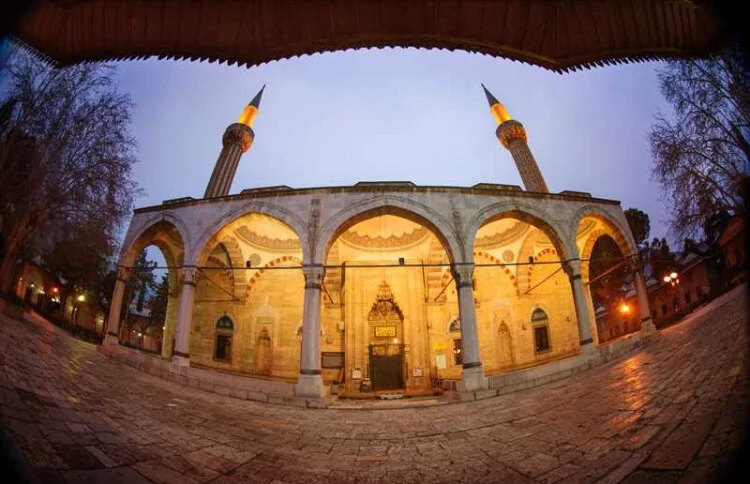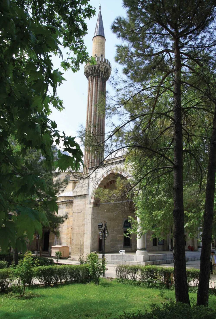 Yan mekânlı ya da zaviyeli cami mimarisinin seçkin örneklerinden biri olan cami, ortada büyük bir kemerle ayrılan iki kare mekânla, doğu ve batı yanlarda üçer kubbeli yan mekânlardan oluşur. Orta mekânı, sekizgen kasnaklarında 16’şar pencere bulunan iki büyük kubbe örter. Kubbe içi ve pencere kemerlerinin üzeri zengin kalem işleri ile süslenmiştir. Ahşap pencere kanatları 15’inci yüzyıl ahşap kündekârî tekniğinin güzel örneklerindendir. Kuzeydeki son cemaat yeri, beş sivri kemerin taşıdığı beş kubbe ile örtülüdür. Son cemaat yerindeki pencere üstleri mavi beyaz çini panolarla süslenmiştir. Buranın iki ucunda yükselen tek şerefeli iki minareden doğudakinin gövdesi dikine yivli, batıdakinin gövdesi ise zikzak taş dekorludur. Caminin mukarnas süslemeli, ihtişamlı taç kapısı üzerindeki üç satırlık mermer kitabe Hattat Ali bin Mezid’in eseridir. Avlu ortasında yer alan 12 kenarlı şadırvan, 12 sütunun taşıdığı, 12 yüzlü sivri piramit bir çatıyla örtülüdür.