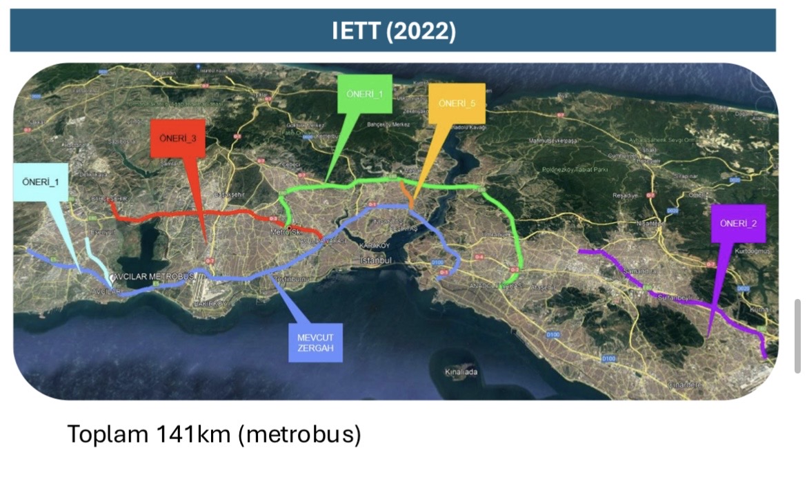 İstanbul SKUp Otobüs Öncelikli Şeritler Çalıştay Raporu’nda, kent genelinde yaklaşık 120 km’lik otobüs öncelikli şerit ağı oluşturulması ve yoğun yolcu talebine sahip koridorların bu kapsamda değerlendirilmesi öneriliyor. Rapordaki haritalarda Bahçeşehir yönünden gelen ana arterler ile Tarihi Yarımada ve merkezi akslar, ayrı ayrı ele alınan güçlü otobüs koridorları olarak öne çıkıyor.